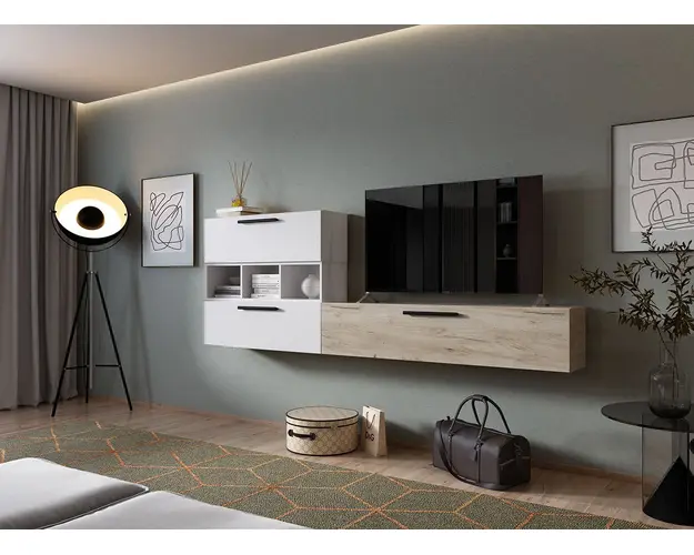 Living Pati 005 - Mobila Sufragerie Stejar + Alb Living Pati 005 - Mobila Sufragerie Stejar + Alb face parte dintr-o categorie de mobilier modern, contemporan ce imbina designul cu utilitatea. Familia de living Pati are 4 decoruri: stejar, alb, gri si beton . Am realizat peste 100 de configuratii din care puteti alege cu dimensiuni si stiluri diferite. Dulapul de haine este optional si puteti alege unul sau mai multe bucati. Livrare gratuita si rapida, 4-10 zile lucratoare prin flota proprie Suntem producatori de mobilier, fara intermediari Toate piesele de mobilier au o garantie de 2 ani Corpurile sunt construite din PAL melaminat de 16mm. Cantul aplicat este de 0,6 ce le permite muchiilor sa fie placute la atingere . Video de prezentare familie Videoul de prezentare poate contine mai multe corpuri de mobilier sau mai putine in comparatie cu produsul de pe aceasta pagina. Scopul acestui video este de a detalia aspectul materialelor, accesoriilor cat si a familiei din care face parte. Dimensiuni Living Pati 005 - Mobila Sufragerie Stejar + Alb Imaginea alaturata prezinta compartimentarea pentru mobila de sufragerie Pati. Aceasta configuratie contine urmatoarele corpuri: 2 x Corp 920: L 92 x H 29 x A 26.7 cm 1 x Corp 1380: L 138 x H 29 x A 26.7 cm 1 x Corp decorativ: L 91.5 x H 23.2 x A 25 cm Optional dulap: L 79.8 x H 185 x A 35 cm Dimensiuni totale living Pati Fara dulap: L 230 x A 26.7 x H 155 cm Cu un dulap: L 309.8 x A 35 x H 185 cm Spatiul de TV: diagonala maxima 139 cm.Toate corpurile se pot pune pe stanga sau pe dreapta in functie de cum doriti. Nu este obligatoriu pozitionarea ca in prezentare. Ele nu sunt prinse unul de celalalt, sunt independente. SCHITA MONTAJ corp 1380 SCHITA MONTAJ corp 920 SCHITA MONTAJ corp decorativ SCHITA MONTAJ dulap 2U Pati Pretul afisat nu include alte accesorii sau obiecte de decor (TV, tablouri, elemente de iluminat, covor etc.) Dimensiunile sunt exprimate in cm si pot oscila intre ± 10 mm. Produsul se livreaza demontat si este insotit de accesorii si instructiuni de asamblare. Produsul cu denumirea Living Pati 005 - Mobila Sufragerie Stejar + Alb face parte din brandul Mobila laguna, se afla in categoria Mobila living si sufragerii si subcategoria