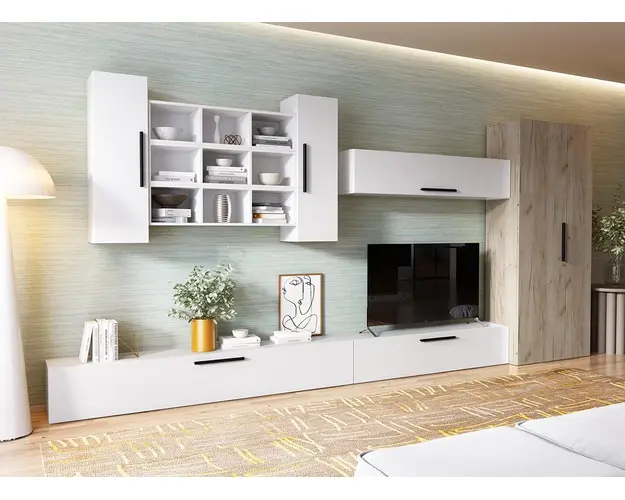 Living Pati 091 - Mobila Sufragerie Alba Living Pati 091 - Mobila Sufragerie Alba face parte dintr-o categorie de mobilier modern, contemporan ce imbina designul cu utilitatea. Familia de living Pati are 4 decoruri: stejar, alb, gri si beton . Am realizat peste 100 de configuratii din care puteti alege cu dimensiuni si stiluri diferite. Dulapul de haine este optional si puteti alege unul sau mai multe bucati. Livrare gratuita si rapida, 4-10 zile lucratoare prin flota proprie Suntem producatori de mobilier, fara intermediari Toate piesele de mobilier au o garantie de 2 ani Corpurile sunt construite din PAL melaminat de 16mm. Cantul aplicat este de 0,6 ce le permite muchiilor sa fie placute la atingere . Video de prezentare familie Videoul de prezentare poate contine alte nuante, mai multe sau mai putine corpuri de mobilier in comparatie cu produsul de pe aceasta pagina. Scopul acestui video este de a detalia aspectul materialelor, accesoriilor cat si a familiei din care face parte. Dimensiuni Living Pati 091 - Mobila Sufragerie Alba Imaginea alaturata prezinta compartimentarea pentru mobila de sufragerie Pati. Aceasta configuratie contine urmatoarele corpuri: 2 x Corp 920: L 92 x H 29 x A 26.7 cm 2 x Corp 1380: L 138 x H 29 x A 26.7 cm 3 x Corp decorativ: L 91.5 x H 23.2 x A 25 cm 1 x Corp 1850: L 185 x H 29 x A 26.7 cm Optional dulap: L 79.8 x H 185 x A 35 cm Dimensiuni totale living Pati Fara dulap: L 323 x A 26.7 x H 160 cm Cu un dulap: L 402.8 x A 35 x H 185 cm Spatiul de TV: diagonala maxima 139 cm.Toate corpurile se pot pune pe stanga sau pe dreapta in functie de cum doriti. Nu este obligatoriu pozitionarea ca in prezentare. Ele nu sunt prinse unul de celalalt, sunt independente. SCHITA MONTAJ CORP 920 VERTICAL SCHITA MONTAJ CORP 1850 COMODA SCHITA MONTAJ CORP 1380 SUPERIOR SCHITA MONTAJ CORP 1380 COMODA SCHITA MONTAJ CORP DECORATIV SCHITA MONTAJ dulap 2U Pati Pretul afisat nu include alte accesorii sau obiecte de decor (TV, tablouri, elemente de iluminat, covor etc.) Dimensiunile sunt exprimate in cm si pot oscila intre ± 10 mm. Produsul se livreaza demontat si este insotit de accesorii si instructiuni de asamblare. Produsul cu denumirea Living Pati 091 - Mobila Sufragerie Alba face parte din brandul Mobila laguna, se afla in categoria Mobila living si sufragerii si subcategoria