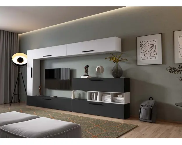 Living Pati 215 - Mobila Sufragerie Gri Antracit + Alb Living Pati 215 - Mobila Sufragerie Gri Antracit + Alb face parte dintr-o categorie de mobilier modern, contemporan ce imbina designul cu utilitatea. Familia de living Pati are 4 decoruri: stejar, alb, gri si beton . Am realizat peste 100 de configuratii din care puteti alege cu dimensiuni si stiluri diferite. Dulapul de haine este optional si puteti alege unul sau mai multe bucati. Livrare gratuita si rapida, 4-10 zile lucratoare prin flota proprie Suntem producatori de mobilier, fara intermediari Toate piesele de mobilier au o garantie de 2 ani Corpurile sunt construite din PAL melaminat de 16mm. Cantul aplicat este de 0,6 ce le permite muchiilor sa fie placute la atingere . Video de prezentare familie Videoul de prezentare poate contine mai multe corpuri de mobilier sau mai putine in comparatie cu produsul de pe aceasta pagina. Scopul acestui video este de a detalia aspectul materialelor, accesoriilor cat si a familiei din care face parte. Dimensiuni Living Pati 215 - Mobila Sufragerie Gri Antracit + Alb Imaginea alaturata prezinta compartimentarea pentru mobila de sufragerie Pati. Aceasta configuratie contine urmatoarele corpuri: 5 x Corp 1380: L 138 x H 29 x A 26.7 cm 1 x Corp 1850 : L 185 x H 29 x A 26.7 cm 1 x Corp decorativ: L 91.5 x H 23.2 x A 25 cm Optional dulap: L 79.8 x H 185 x A 35 cm Dimensiuni totale living Pati Fara dulap: L 323 x A 26.7 x H 170 cm Cu un dulap: L 402.8 x A 35 x H 185 cm Spatiul de TV: diagonala maxima 139 cm.Toate corpurile se pot pune pe stanga sau pe dreapta in functie de cum doriti. Nu este obligatoriu pozitionarea ca in prezentare. Ele nu sunt prinse unul de celalalt, sunt independente. SCHITA MONTAJ corp 1850 comoda SCHITA MONTAJ corp 1380 superior SCHITA MONTAJ corp 1380 vertical SCHITA MONTAJ corp 1380 comoda / inferior SCHITA MONTAJ CORP DECORATIV SCHITA MONTAJ dulap 2U Pati Pretul afisat nu include alte accesorii sau obiecte de decor (TV, tablouri, elemente de iluminat, covor etc.) Dimensiunile sunt exprimate in cm si pot oscila intre ± 10 mm. Produsul se livreaza demontat si este insotit de accesorii si instructiuni de asamblare. Produsul cu denumirea Living Pati 215 - Mobila Sufragerie Gri Antracit + Alb face parte din brandul Mobila laguna, se afla in categoria Mobila living si sufragerii si subcategoria