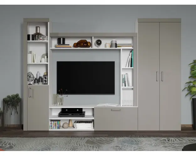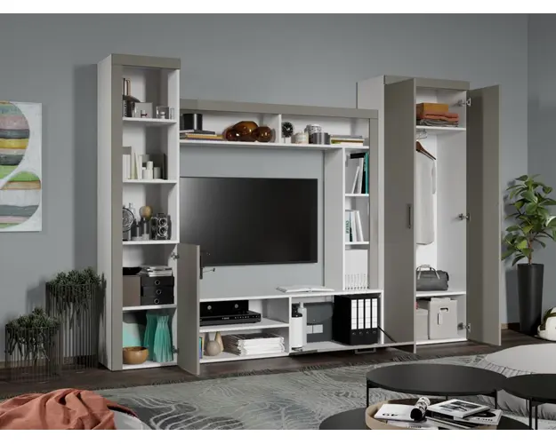Living Sori Combo Living Sori Combo face parte din familia de sufragerie / living Sori . Fara surprize la livrare, diferente de culoare sau calitate Livrare gratuita si rapida, 4-10 zile lucratoare prin flota proprie Suntem producatori de mobilier, fara intermediari Toate piesele de mobilier au o garantie de 2 ani Living Sori Combo Am pregatit pentru dumneavoastra un un living modern si practic. Acesta este construit din PAL melaminat de 16mm cu finisaj Alb si Casmir, care, impreuna cu manerele Negre cu insertie Casmir, creeaza un contrast rafinat si un ambient placut. Cantul aplicat este unul de 0,6 care le permite muchiilor sa fie placute la atingere fiind finisate si atent retusate. Spatii de depozitare generoase cu usi , atat pentru haine cat si pentru obiecte diverse. Latime: 248 cm Adancime: 36 cm Inaltime: 180 cm Living Clop Livingul Sori contine 2 spatii prevazute cu usi pentru depozitare . Pe langa acestea exista si 10 spatii de depozitare delimitate cu diverse dimensiuni si forme. Practic, compact si modern. Latime: 180 cm Adancime: 36 cm Inaltime: 180 cm DESCARCA SCHITA DE MONTAJ LIVING CLOP In spatiul pentru televizor recomandam un TV cu o diagonala de maxim 110 cm astfel incat sa se incadreze. Acesta poate fi prins pe perete sau sa stea pe picior pe suprafata livingului. Spatiu/ gol living pentru TV H 92.7 cm x L 114.2 cm Atentie! Pretul afisat nu include umerasele si alte accesorii sau obiecte de decor (haine, cutii, covor etc.) Dimensiunile pot oscila intre ± 10 mm. Produsul se livreaza demontat si este insotit de accesorii si instructiuni de asamblare. Dulap haine Sori Dulapul Sori contine un sistem de umerase retractabil si foarte practic, incap pana la 20 de umerase. Pe langa acesta exista si 2 spatii de depozitare delimitate in partea de sus si de jos a dulapului. Practic, compact si modern. Latime: 68.1 cm Adancime: 36 cm Inaltime: 180 cm DESCARCA SCHITA DE MONTAJ DULAP CLOP Atentie! Pretul afisat nu include umerasele si alte accesorii sau obiecte de decor (haine, cutii, covor etc.) Dimensiunile pot oscila intre ± 10 mm. Produsul se livreaza demontat si este insotit de accesorii si instructiuni de asamblare. Produsul cu denumirea Living Sori Combo face parte din brandul Mobila laguna, se afla in categoria Mobila living si sufragerii si subcategoria