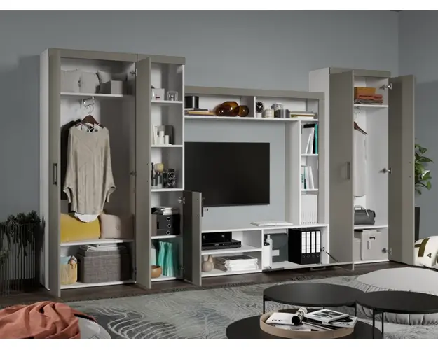 Living Sori Combo Plus Living Sori Combo Plus face parte din familia de sufragerie / living Sori . Fara surprize la livrare, diferente de culoare sau calitate Livrare gratuita si rapida, 4-10 zile lucratoare prin flota proprie Suntem producatori de mobilier, fara intermediari Toate piesele de mobilier au o garantie de 2 ani Living Sori Combo Plus Am pregatit pentru dumneavoastra un un living modern si practic. Acesta este construit din PAL melaminat de 16mm cu finisaj Alb si Casmir, care, impreuna cu manerele Negre cu insertie Casmir, creeaza un contrast rafinat si un ambient placut. Cantul aplicat este unul de 0,6 care le permite muchiilor sa fie placute la atingere fiind finisate si atent retusate. Spatii de depozitare generoase cu usi , atat pentru haine cat si pentru obiecte diverse. Latime: 316 cm Adancime: 36 cm Inaltime: 180 cm Living Clop Livingul Sori contine 2 spatii prevazute cu usi pentru depozitare . Pe langa acestea exista si 10 spatii de depozitare delimitate cu diverse dimensiuni si forme. Practic, compact si modern. Latime: 180 cm Adancime: 36 cm Inaltime: 180 cm DESCARCA SCHITA DE MONTAJ LIVING CLOP In spatiul pentru televizor recomandam un TV cu o diagonala de maxim 110 cm astfel incat sa se incadreze. Acesta poate fi prins pe perete sau sa stea pe picior pe suprafata livingului. Spatiu/ gol living pentru TV H 92.7 cm x L 114.2 cm Atentie! Pretul afisat nu include umerasele si alte accesorii sau obiecte de decor (haine, cutii, covor etc.) Dimensiunile pot oscila intre ± 10 mm. Produsul se livreaza demontat si este insotit de accesorii si instructiuni de asamblare. Dulap haine Sori x 2 Dulapul Sori contine un sistem de umerase retractabil si foarte practic, incap pana la 20 de umerase. Pe langa acesta exista si 2 spatii de depozitare delimitate in partea de sus si de jos a dulapului. Practic, compact si modern. Latime: 68.1 cm Adancime: 36 cm Inaltime: 180 cm DESCARCA SCHITA DE MONTAJ DULAP CLOP Atentie! Pretul afisat nu include umerasele si alte accesorii sau obiecte de decor (haine, cutii, covor etc.) Dimensiunile pot oscila intre ± 10 mm. Produsul se livreaza demontat si este insotit de accesorii si instructiuni de asamblare. Produsul cu denumirea Living Sori Combo Plus face parte din brandul Mobila laguna, se afla in categoria Mobila living si sufragerii si subcategoria
