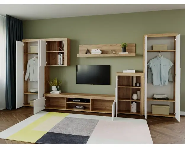 Living Milan Modul A Comoda Lunga Living Milan Modul B Comoda Inalta Living Milan Modul E Corp Suspendat Living Milan - Modul F / G Polita Living Milan - Modul H Dulap Mobila sufragerie - Living Milan C2 DUO Stejar Mobila sufragerie - Living Milan C2 DUO Stejar face parte din familia de mobila pentru living Milan. Aceasta familie are un aspect modern si este compusa din mai multe module. Fara surprize la livrare, diferente de culoare sau calitate Livrare gratuita si rapida, 4-10 zile lucratoare prin flota proprie Suntem producatori de mobilier, fara intermediari Toate piesele de mobilier au o garantie de 2 ani Puteti alege direct din configuratiile realizate de noi sau daca doriti puteti creea singuri propria configuratie de living combinand din cele 8 corpuri de mobila. In functie de spatiul unde doriti sa amplasati mobila puteti adapta livingul pentru o potrivire perfecta. Corpurile sunt construite din PAL Kronospan melaminat de 16mmcu finisaj Stejar Auriu si Alb Mat, o textura similara lemnului, care creeaza un contrast rafinat si un ambient placut. Cantul aplicat este unul de 0,6 care le permite muchiilor sa fie placute la atingere fiind finisate si atent retusate. Dimensiuni Mobila sufragerie - Living Milan C2 DUO Stejar Imaginea alaturata prezinta compartimentarea interioara si exterioara pentru mobila de sufragerie Milan. Aceasta configuratie are 6 corpuri modulare , 2 suspendate si 4 pe sol. Spatii de depozitare cu usa cat si etajere si polita. Dulapurile au cate 2 spatii de depozitare si o bara pentru haine. Pot fi folosite si pentru haine cat si pentru obiecte diverse. Dimensiuni corpuri: Comoda TV: L 180 x A 35.2 x H 39.8cm Comoda Inalta: L 60 x A 30.4 x H 96.8cm Dulap 2 usi x 2 buc: L 67.6 x A 30.4 x H 182cm Corp Suspendat: L 60 x A 30.4 x H 69.8cm Polita 1390 : L 139 x A 21.6 x H 34.8cm Dimensiuni totale livin L 375.2 x A 35.2 x H 182 cm Spatiul de TV: diagonala max 126cm/50" (sau mai mare) Recomandam un TV cu o diagonala de maxim 126cm/50". Se pot pune si TV-uri cu diagonala mai mare mutand corpul suspendat in alta pozitie. Dulapurile si toate corpurile se pot pune pe stanga sau pe dreapta in functie de cum doriti. Nu este obligatoriu pozitionarea ca in prezentare. Ele nu sunt prinse fix unul de celalalt. Info si schite montaj mobila sufragerie Schite de montaj: DESCARCA SCHITA MONTAJ COMODA LUNGA MILAN DESCARCA SCHITA MONTAJ COMODA INALTA MILAN DESCARCA SCHITA MONTAJ CORP SUSPENDAT MILAN DESCARCA SCHITA MONTAJ POLITA MILAN DESCARCA SCHITA MONTAJ DULAP MILAN Pretul afisat nu include alte accesorii sau obiecte de decor (TV, tablouri, elemente de iluminat, covor etc.) Dimensiunile sunt exprimate in cm si pot oscila intre ± 10 mm. Produsul se livreaza demontat si este insotit de accesorii si instructiuni de asamblare. Produsul cu denumirea Mobila sufragerie - Living Milan C2 DUO Stejar face parte din brandul Mobila laguna, se afla in categoria Mobila living si sufragerii si subcategoria