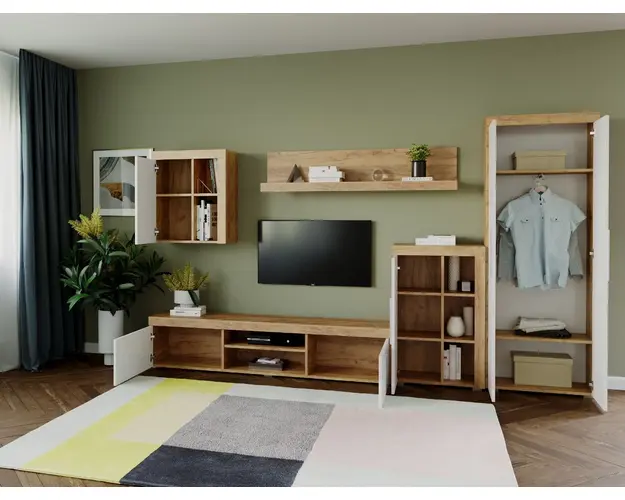 Living Milan Modul A Comoda Lunga Living Milan Modul B Comoda Inalta Living Milan Modul E Corp Suspendat Living Milan - Modul F / G Polita Living Milan - Modul H Dulap Mobila sufragerie - Living Milan C2 UNO Stejar Mobila sufragerie - Living Milan C2 UNO Stejar face parte din familia de mobila pentru living Milan. Aceasta familie are un aspect modern si este compusa din mai multe module. Fara surprize la livrare, diferente de culoare sau calitate Livrare gratuita si rapida, 4-10 zile lucratoare prin flota proprie Suntem producatori de mobilier, fara intermediari Toate piesele de mobilier au o garantie de 2 ani Puteti alege direct din configuratiile realizate de noi sau daca doriti puteti creea singuri propria configuratie de living combinand din cele 8 corpuri de mobila. In functie de spatiul unde doriti sa amplasati mobila puteti adapta livingul pentru o potrivire perfecta. Corpurile sunt construite din PAL Kronospan melaminat de 16mmcu finisaj Stejar Auriu si Alb Mat, o textura similara lemnului, care creeaza un contrast rafinat si un ambient placut. Cantul aplicat este unul de 0,6 care le permite muchiilor sa fie placute la atingere fiind finisate si atent retusate. Dimensiuni Mobila sufragerie - Living Milan C2 UNO Stejar Imaginea alaturata prezinta compartimentarea interioara si exterioara pentru mobila de sufragerie Milan. Aceasta configuratie are 5 corpuri modulare , 2 suspendate si 3 pe sol. Spatii de depozitare cu usa cat si etajere si polita. Dulapul are 2 spatii de depozitare si o bara pentru haine. Poate fi folosit si pentru haine cat si pentru obiecte diverse. Dimensiuni corpuri: Comoda TV: L 180 x A 35.2 x H 39.8cm Comoda Inalta: L 60cm x A 30.4 x H 96.8cm Dulap 2 usi: L 67.6 x A 30.4 x H 182cm Corp Suspendat: L 60 x A 30.4 x H 69.8cm Polita 1390 : L 139 x A 21.6 x H 34.8cm Dimensiuni totale livin L 307.6 x A 35.2 x H 182cm Spatiul de TV: diagonala max 126cm/50" (sau mai mare) Recomandam un TV cu o diagonala de maxim 126cm/50". Se pot pune si TV-uri cu diagonala mai mare mutand corpul suspendat mai in stanga. Dulapul si toate corpurile se pot pune pe stanga sau pe dreapta in functie de cum doriti. Nu este obligatoriu pozitionarea ca in prezentare. Ele nu sunt prinse fix unul de celalalt. Info si schite montaj mobila sufragerie Schite de montaj: DESCARCA SCHITA MONTAJ COMODA LUNGA MILAN DESCARCA SCHITA MONTAJ COMODA INALTA MILAN DESCARCA SCHITA MONTAJ CORP SUSPENDAT MILAN DESCARCA SCHITA MONTAJ POLITA MILAN DESCARCA SCHITA MONTAJ DULAP MILAN Pretul afisat nu include alte accesorii sau obiecte de decor (TV, tablouri, elemente de iluminat, covor etc.) Dimensiunile sunt exprimate in cm si pot oscila intre ± 10 mm. Produsul se livreaza demontat si este insotit de accesorii si instructiuni de asamblare. Produsul cu denumirea Mobila sufragerie - Living Milan C2 UNO Stejar face parte din brandul Mobila laguna, se afla in categoria Mobila living si sufragerii si subcategoria