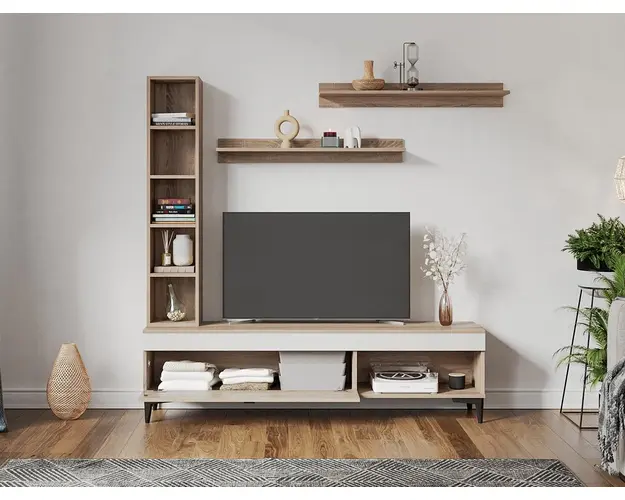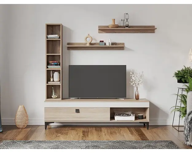 Living Scandinav Rafa 06 Un living in stil scandinav este aerisit, calduros, imbina texturi si materiale diverse si iti da o stare de relaxare, in aceasta categorie de mobilier se incadreza si setul de Living Scandinav Rafa 06. Aceasta colectie are un stil nordic si este alcatuita din mai multe corpuri. Puteti alege direct din configuratiile realizate de noi sau daca doriti puteti creea singuri propria configuratie de living combinand din corpurile de mobila pentru living astfel incat sa se potriveasca perfect in spatiul dorit. Livrare gratuita si rapida, 4-10 zile lucratoare prin flota proprie Suntem producatori de mobilier, fara intermediari Toate piesele de mobilier au o garantie de 2 ani Mobila Sufragerie stil nordic Corpurile sunt construite din PAL melaminat de 16mm cu finisaj alb si sonoma , cel din urma avand o textura similara lemnului, impreuna cu manerele si picioarele negre creeaza un contrast rafinat si un ambient placut. Cantul aplicat este unul de 0,6 ce le permite muchiilor sa fie placute la atingere . Dimensiuni Rafa 06 - Living Scandinav Imaginea alaturata prezinta compartimentarea pentru mobila de sufragerie Rafa. Aceasta configuratie are 4 corpuri modulare , 2 suspendate si 2 nesuspendate. Un spatiu de depozitare cu usa unul fara, corp cu etajere si 2 polite. Dimensiuni corpuri componente: Comoda TV 1600 Rafa: L 160 x A 33.5 x H 43.7 cm Set 2 Polite Suspendate Rafa: L 91.8 x A 18.6 x H 12 cm Corp decorarativ cu polite: L 120 x A 22 x H 25 cm Inaltime picioare 12cm, este inclusa in dimensiunile corpurilor si dimensiunea totala. Dimensiuni totale livin L 160 x A 33.5 x H 170 cm (inaltimea poate varia in functie de inaltimea pentru care optati atunci cand suspendati corpurile superioare) Spatiul de TV: diagonala recomandata maxima 180cm/70" Toate corpurile se pot pune pe stanga sau pe dreapta in functie de cum doriti. Nu este obligatoriu pozitionarea ca in prezentare. Ele nu sunt prinse unul de celalalt. Info si schite montaj mobila sufragerie Schite de montaj: DESCARCA SCHITA COMODA TV 1600 DESCARCA SCHITA POLITA DESCARCA SCHITA CORP DECORARATIV CU POLITE Pretul afisat nu include alte accesorii sau obiecte de decor (TV, tablouri, elemente de iluminat, covor etc.) Dimensiunile sunt exprimate in cm si pot oscila intre ± 10 mm. Produsul se livreaza demontat si este insotit de accesorii si instructiuni de asamblare. Produsul cu denumirea Rafa 06 - Living Scandinav face parte din brandul Mobila laguna, se afla in categoria Mobila living si sufragerii si subcategoria