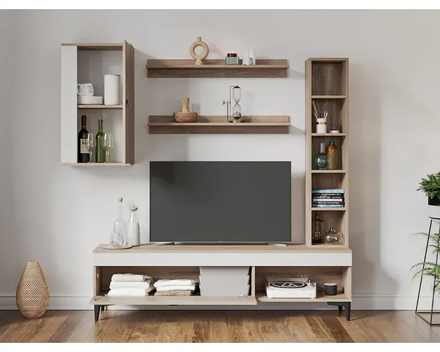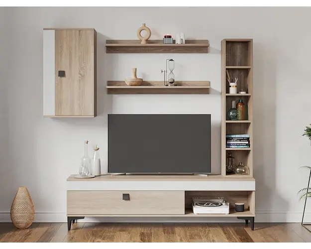 Living Scandinav Rafa 09 Un living in stil scandinav este aerisit, calduros, imbina texturi si materiale diverse si iti da o stare de relaxare, in aceasta categorie de mobilier se incadreza si setul de Living Scandinav Rafa 09. Aceasta colectie are un stil nordic si este alcatuita din mai multe corpuri. Puteti alege direct din configuratiile realizate de noi sau daca doriti puteti creea singuri propria configuratie de living combinand din corpurile de mobila pentru living astfel incat sa se potriveasca perfect in spatiul dorit. Livrare gratuita si rapida, 4-10 zile lucratoare prin flota proprie Suntem producatori de mobilier, fara intermediari Toate piesele de mobilier au o garantie de 2 ani Mobila Sufragerie stil nordic Corpurile sunt construite din PAL melaminat de 16mm cu finisaj alb si sonoma , cel din urma avand o textura similara lemnului, impreuna cu manerele si picioarele negre creeaza un contrast rafinat si un ambient placut. Cantul aplicat este unul de 0,6 ce le permite muchiilor sa fie placute la atingere . Dimensiuni Rafa 09 - Living Scandinav Imaginea alaturata prezinta compartimentarea pentru mobila de sufragerie Rafa. Aceasta configuratie are 5 corpuri modulare , 3 suspendate si 2 nesuspendate. Spatii de depozitare cu usa cat si etajere si polite. Dimensiuni corpuri componente: Comoda TV 1600 Rafa: L 160 x A 33.5 x H 43.7 cm Corp Superior Rafa: L 43.9 x A 26.6 x H 77 cm Set 2 Polite Suspendate Rafa: L 91.8 x A 18.6 x H 12 cm Corp decorarativ cu polite: L 120 x A 22 x H 25 cm Inaltime picioare 12cm, este inclusa in dimensiunile corpurilor si dimensiunea totala. Dimensiuni totale livin L 180 x A 33.5 x H 170 cm (inaltimea poate varia in functie de inaltimea pentru care optati atunci cand suspendati corpurile superioare) Spatiul de TV: diagonala recomandata maxima 180cm/70" Toate corpurile se pot pune pe stanga sau pe dreapta in functie de cum doriti. Nu este obligatoriu pozitionarea ca in prezentare. Ele nu sunt prinse unul de celalalt. Info si schite montaj mobila sufragerie Schite de montaj: DESCARCA SCHITA COMODA TV 1600 DESCARCA SCHITA CORP SUPERIOR DESCARCA SCHITA POLITA DESCARCA SCHITA CORP DECORARATIV CU POLITE Pretul afisat nu include alte accesorii sau obiecte de decor (TV, tablouri, elemente de iluminat, covor etc.) Dimensiunile sunt exprimate in cm si pot oscila intre ± 10 mm. Produsul se livreaza demontat si este insotit de accesorii si instructiuni de asamblare. Produsul cu denumirea Rafa 09 - Living Scandinav face parte din brandul Mobila laguna, se afla in categoria Mobila living si sufragerii si subcategoria