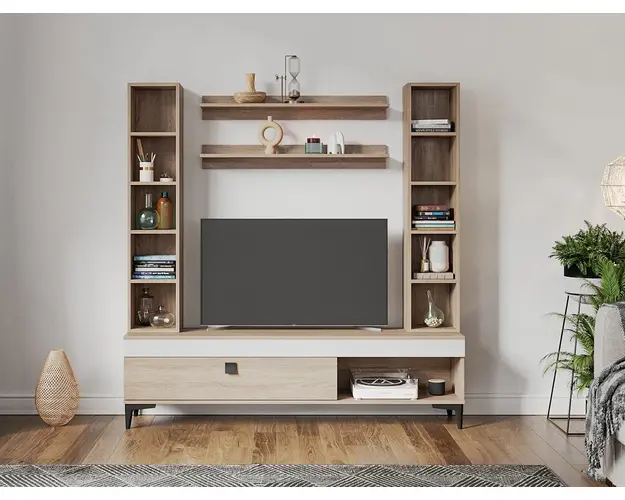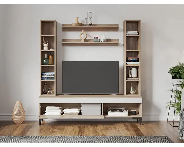Rafa 12 - Living Scandinav Un living in stil scandinav este aerisit, calduros, imbina texturi si materiale diverse si iti da o stare de relaxare, in aceasta categorie de mobilier se incadreza si setul de Rafa 12 - Living Scandinav. Aceasta colectie are un stil nordic si este alcatuita din mai multe corpuri. Puteti alege direct din configuratiile realizate de noi sau daca doriti puteti creea singuri propria configuratie de living combinand din corpurile de mobila pentru living astfel incat sa se potriveasca perfect in spatiul dorit. Livrare gratuita si rapida, 4-10 zile lucratoare prin flota proprie Suntem producatori de mobilier, fara intermediari Toate piesele de mobilier au o garantie de 2 ani Mobila Sufragerie stil nordic Corpurile sunt construite din PAL melaminat de 16mm cu finisaj alb si sonoma , cel din urma avand o textura similara lemnului, impreuna cu manerele si picioarele negre creeaza un contrast rafinat si un ambient placut. Cantul aplicat este unul de 0,6 ce le permite muchiilor sa fie placute la atingere . Dimensiuni Rafa 12 - Living Scandinav Imaginea alaturata prezinta compartimentarea pentru mobila de sufragerie Rafa. Aceasta configuratie are 5 corpuri modulare , 2 suspendate si 3 nesuspendate. Spatii de depozitare cu usa si polite. Dimensiuni corpuri componente: Comoda TV 1600 Rafa: L 160 x A 33.5 x H 43.7 cm 2 x Corp decorarativ cu polite: L 120 x A 22 x H 25 cm Set 2 Polite Suspendate Rafa: L 91.8 x A 18.6 x H 12 cm Inaltime picioare 12cm, este inclusa in dimensiunile corpurilor si dimensiunea totala. Dimensiuni totale livin L 160 x A 33.5 x H 170 cm Spatiul de TV: diagonala recomandata maxima 180cm/70" Toate corpurile se pot pune pe stanga sau pe dreapta in functie de cum doriti. Nu este obligatoriu pozitionarea ca in prezentare. Ele nu sunt prinse unul de celalalt. Info si schite montaj mobila sufragerie Schite de montaj: DESCARCA SCHITA COMODA TV 1600 DESCARCA SCHITA CORP DECORARATIV CU POLITE DESCARCA SCHITA POLITA Pretul afisat nu include alte accesorii sau obiecte de decor (TV, tablouri, elemente de iluminat, covor etc.) Dimensiunile sunt exprimate in cm si pot oscila intre ± 10 mm. Produsul se livreaza demontat si este insotit de accesorii si instructiuni de asamblare. Produsul cu denumirea Rafa 12 - Living Scandinav face parte din brandul Mobila laguna, se afla in categoria Mobila living si sufragerii si subcategoria