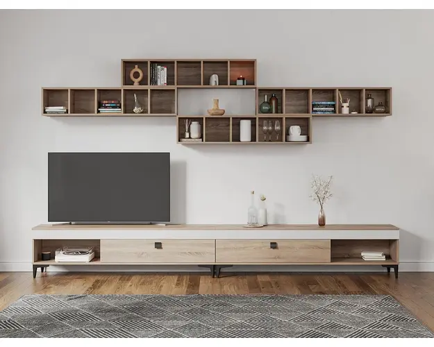 Living Scandinav Rafa 13 Un living in stil scandinav este aerisit, calduros, imbina texturi si materiale diverse si iti da o stare de relaxare, in aceasta categorie de mobilier se incadreza si setul de Living Scandinav Rafa 13. Aceasta colectie are un stil nordic si este alcatuita din mai multe corpuri. Puteti alege direct din configuratiile realizate de noi sau daca doriti puteti creea singuri propria configuratie de living combinand din corpurile de mobila pentru living astfel incat sa se potriveasca perfect in spatiul dorit. Livrare gratuita si rapida, 4-10 zile lucratoare prin flota proprie Suntem producatori de mobilier, fara intermediari Toate piesele de mobilier au o garantie de 2 ani Mobila Sufragerie stil nordic Corpurile sunt construite din PAL melaminat de 16mm cu finisaj alb si sonoma , cel din urma avand o textura similara lemnului, impreuna cu manerele si picioarele negre creeaza un contrast rafinat si un ambient placut. Cantul aplicat este unul de 0,6 ce le permite muchiilor sa fie placute la atingere . Dimensiuni Rafa 13 - Living Scandinav Imaginea alaturata prezinta compartimentarea pentru mobila de sufragerie Rafa. Aceasta configuratie are 6 corpuri modulare , 4 suspendate si 2 pe sol. Spatii de depozitare cu usa cat si etajere si polite. Dimensiuni corpuri componente: 2 x Comoda TV 1600: L 160 x A 33.5 x H 43.7 cm 4 x Corp decorarativ cu polite: L 120 x A 22 x H 25 cm Inaltime picioare 12cm, este inclusa in dimensiunile corpurilor si dimensiunea totala. Dimensiuni totale livin L 320 x A 33.5 x H 170 cm (inaltimea poate varia in functie de inaltimea pentru care optati atunci cand suspendati corpurile superioare) Spatiul de TV: diagonala recomandata maxima 180cm/70" Toate corpurile se pot pune pe stanga sau pe dreapta in functie de cum doriti. Nu este obligatoriu pozitionarea ca in prezentare. Ele nu sunt prinse unul de celalalt. Info si schite montaj mobila sufragerie Schite de montaj: DESCARCA SCHITA COMODA TV 1600 DESCARCA SCHITA CORP DECORARATIV CU POLITE Pretul afisat nu include alte accesorii sau obiecte de decor (TV, tablouri, elemente de iluminat, covor etc.) Dimensiunile sunt exprimate in cm si pot oscila intre ± 10 mm. Produsul se livreaza demontat si este insotit de accesorii si instructiuni de asamblare. Produsul cu denumirea Rafa 13 - Living Scandinav face parte din brandul Mobila laguna, se afla in categoria Mobila living si sufragerii si subcategoria
