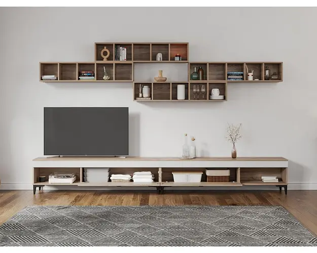 Living Scandinav Rafa 13 Un living in stil scandinav este aerisit, calduros, imbina texturi si materiale diverse si iti da o stare de relaxare, in aceasta categorie de mobilier se incadreza si setul de Living Scandinav Rafa 13. Aceasta colectie are un stil nordic si este alcatuita din mai multe corpuri. Puteti alege direct din configuratiile realizate de noi sau daca doriti puteti creea singuri propria configuratie de living combinand din corpurile de mobila pentru living astfel incat sa se potriveasca perfect in spatiul dorit. Livrare gratuita si rapida, 4-10 zile lucratoare prin flota proprie Suntem producatori de mobilier, fara intermediari Toate piesele de mobilier au o garantie de 2 ani Mobila Sufragerie stil nordic Corpurile sunt construite din PAL melaminat de 16mm cu finisaj alb si sonoma , cel din urma avand o textura similara lemnului, impreuna cu manerele si picioarele negre creeaza un contrast rafinat si un ambient placut. Cantul aplicat este unul de 0,6 ce le permite muchiilor sa fie placute la atingere . Dimensiuni Rafa 13 - Living Scandinav Imaginea alaturata prezinta compartimentarea pentru mobila de sufragerie Rafa. Aceasta configuratie are 6 corpuri modulare , 4 suspendate si 2 pe sol. Spatii de depozitare cu usa cat si etajere si polite. Dimensiuni corpuri componente: 2 x Comoda TV 1600: L 160 x A 33.5 x H 43.7 cm 4 x Corp decorarativ cu polite: L 120 x A 22 x H 25 cm Inaltime picioare 12cm, este inclusa in dimensiunile corpurilor si dimensiunea totala. Dimensiuni totale livin L 320 x A 33.5 x H 170 cm (inaltimea poate varia in functie de inaltimea pentru care optati atunci cand suspendati corpurile superioare) Spatiul de TV: diagonala recomandata maxima 180cm/70" Toate corpurile se pot pune pe stanga sau pe dreapta in functie de cum doriti. Nu este obligatoriu pozitionarea ca in prezentare. Ele nu sunt prinse unul de celalalt. Info si schite montaj mobila sufragerie Schite de montaj: DESCARCA SCHITA COMODA TV 1600 DESCARCA SCHITA CORP DECORARATIV CU POLITE Pretul afisat nu include alte accesorii sau obiecte de decor (TV, tablouri, elemente de iluminat, covor etc.) Dimensiunile sunt exprimate in cm si pot oscila intre ± 10 mm. Produsul se livreaza demontat si este insotit de accesorii si instructiuni de asamblare. Produsul cu denumirea Rafa 13 - Living Scandinav face parte din brandul Mobila laguna, se afla in categoria Mobila living si sufragerii si subcategoria