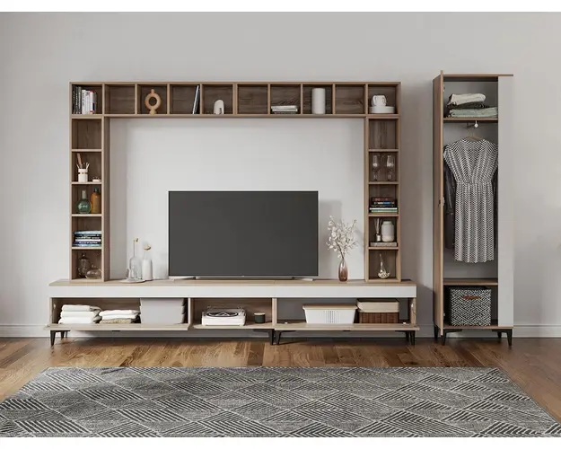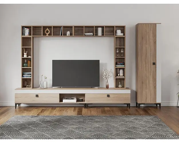Living Scandinav Rafa 17 Un living in stil scandinav este aerisit, calduros, imbina texturi si materiale diverse si iti da o stare de relaxare, in aceasta categorie de mobilier se incadreza si setul de Living Scandinav Rafa 17. Aceasta colectie are un stil nordic si este alcatuita din mai multe corpuri. Puteti alege direct din configuratiile realizate de noi sau daca doriti puteti creea singuri propria configuratie de living combinand din corpurile de mobila pentru living astfel incat sa se potriveasca perfect in spatiul dorit. Livrare gratuita si rapida, 4-10 zile lucratoare prin flota proprie Suntem producatori de mobilier, fara intermediari Toate piesele de mobilier au o garantie de 2 ani Mobila Sufragerie stil nordic Corpurile sunt construite din PAL melaminat de 16mm cu finisaj alb si sonoma , cel din urma avand o textura similara lemnului, impreuna cu manerele si picioarele negre creeaza un contrast rafinat si un ambient placut. Cantul aplicat este unul de 0,6 ce le permite muchiilor sa fie placute la atingere . Dimensiuni Rafa 17 - Living Scandinav Imaginea alaturata prezinta compartimentarea pentru mobila de sufragerie Rafa. Aceasta configuratie are 10 corpuri modulare , 4 suspendate si 6 nesuspendate. Spatii de depozitare cu usa cat si etajere si polite. Dulapurile au bare de haine. Dimensiuni corpuri componente: Comoda TV 1600: L 160 x A 33.5 x H 43.7 cm Comoda TV 1000: L 100 x A 33.5 x H 43.7 cm 4 x Corp decorarativ cu polite: L 120 x A 22 x H 25 cm Dulap de haine: L 51.6 x A 35.1 x H 192.4 cm Inaltime picioare 12cm, este inclusa in dimensiunile corpurilor si dimensiunea totala. Dimensiuni totale livin L 320 x A 35.1 x H 192.4 cm (inaltimea poate varia in functie de inaltimea pentru care optati atunci cand suspendati corpurile superioare) Spatiul de TV: diagonala recomandata maxima 180cm/70" Toate corpurile se pot pune pe stanga sau pe dreapta in functie de cum doriti. Nu este obligatoriu pozitionarea ca in prezentare. Ele nu sunt prinse unul de celalalt. Info si schite montaj mobila sufragerie Schite de montaj: DESCARCA SCHITA COMODA TV 1000 DESCARCA SCHITA COMODA TV 1600 DESCARCA SCHITA CORP DECORARATIV CU POLITE DESCARCA SCHITA POLITA DESCARCA SCHITA DULAP HAINE Pretul afisat nu include alte accesorii sau obiecte de decor (TV, tablouri, elemente de iluminat, covor etc.) Dimensiunile sunt exprimate in cm si pot oscila intre ± 10 mm. Produsul se livreaza demontat si este insotit de accesorii si instructiuni de asamblare. Produsul cu denumirea Rafa 17 - Living Scandinav face parte din brandul Mobila laguna, se afla in categoria Mobila living si sufragerii si subcategoria