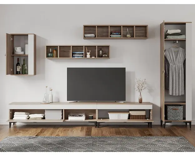 Living Scandinav Rafa 18 Un living in stil scandinav este aerisit, calduros, imbina texturi si materiale diverse si iti da o stare de relaxare, in aceasta categorie de mobilier se incadreza si setul de Living Scandinav Rafa 18. Aceasta colectie are un stil nordic si este alcatuita din mai multe corpuri. Puteti alege direct din configuratiile realizate de noi sau daca doriti puteti creea singuri propria configuratie de living combinand din corpurile de mobila pentru living astfel incat sa se potriveasca perfect in spatiul dorit. Livrare gratuita si rapida, 4-10 zile lucratoare prin flota proprie Suntem producatori de mobilier, fara intermediari Toate piesele de mobilier au o garantie de 2 ani Mobila Sufragerie stil nordic Corpurile sunt construite din PAL melaminat de 16mm cu finisaj alb si sonoma , cel din urma avand o textura similara lemnului, impreuna cu manerele si picioarele negre creeaza un contrast rafinat si un ambient placut. Cantul aplicat este unul de 0,6 ce le permite muchiilor sa fie placute la atingere . Dimensiuni Rafa 18 - Living Scandinav Imaginea alaturata prezinta compartimentarea pentru mobila de sufragerie Rafa. Aceasta configuratie are 6 corpuri modulare , 3 suspendate si 3 nesuspendate. Spatii de depozitare cu usa cat si etajere si polite. Dulapul are bara de haine. Dimensiuni corpuri componente: Comoda TV 1600: L 160 x A 33.5 x H 43.7 cm Comoda TV 1000: L 100 x A 33.5 x H 43.7 cm 2 x Corp decorarativ cu polite: L 120 x A 22 x H 25 cm Corp Superior: L 43.9 x A 26.6 x H 77 cm Dulap de haine: L 51.6 x A 35.1 x H 192.4 cm Inaltime picioare 12cm, este inclusa in dimensiunile corpurilor si dimensiunea totala. Dimensiuni totale livin L 320 x A 35.1 x H 192.4 cm (inaltimea poate varia in functie de inaltimea pentru care optati atunci cand suspendati corpurile superioare) Spatiul de TV: diagonala recomandata maxima 180cm/70" Toate corpurile se pot pune pe stanga sau pe dreapta in functie de cum doriti. Nu este obligatoriu pozitionarea ca in prezentare. Ele nu sunt prinse unul de celalalt. Info si schite montaj mobila sufragerie Schite de montaj: DESCARCA SCHITA COMODA TV 1000 DESCARCA SCHITA COMODA TV 1600 DESCARCA SCHITA CORP SUPERIOR DESCARCA SCHITA CORP DECORARATIV CU POLITE DESCARCA SCHITA DULAP HAINE Pretul afisat nu include alte accesorii sau obiecte de decor (TV, tablouri, elemente de iluminat, covor etc.) Dimensiunile sunt exprimate in cm si pot oscila intre ± 10 mm. Produsul se livreaza demontat si este insotit de accesorii si instructiuni de asamblare. Produsul cu denumirea Rafa 18 - Living Scandinav face parte din brandul Mobila laguna, se afla in categoria Mobila living si sufragerii si subcategoria