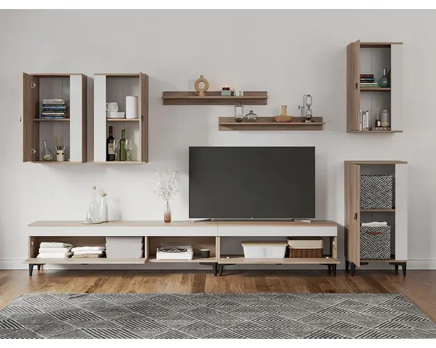 Living Scandinav Rafa 23 Un living in stil scandinav este aerisit, calduros, imbina texturi si materiale diverse si iti da o stare de relaxare, in aceasta categorie de mobilier se incadreza si setul de Living Scandinav Rafa 23. Aceasta colectie are un stil nordic si este alcatuita din mai multe corpuri. Puteti alege direct din configuratiile realizate de noi sau daca doriti puteti creea singuri propria configuratie de living combinand din corpurile de mobila pentru living astfel incat sa se potriveasca perfect in spatiul dorit. Livrare gratuita si rapida, 4-10 zile lucratoare prin flota proprie Suntem producatori de mobilier, fara intermediari Toate piesele de mobilier au o garantie de 2 ani Mobila Sufragerie stil nordic Corpurile sunt construite din PAL melaminat de 16mm cu finisaj alb si sonoma , cel din urma avand o textura similara lemnului, impreuna cu manerele si picioarele negre creeaza un contrast rafinat si un ambient placut. Cantul aplicat este unul de 0,6 ce le permite muchiilor sa fie placute la atingere . Dimensiuni Rafa 23 - Living Scandinav Imaginea alaturata prezinta compartimentarea pentru mobila de sufragerie Rafa. Aceasta configuratie are 8 corpuri modulare , 5 suspendate si 3 pe sol. Spatii de depozitare cu usa cat si etajere si polite. Dimensiuni corpuri componente: Comoda TV 1000: L 100 x A 33.5 x H 43.7 cm Comoda TV 1600: L 160 x A 33.5 x H 43.7 cm 3 x Corp Superior: L 43.9 x A 26.6 x H 77 cm Corp Inferior: L 48 x A 33.6 x H 96.8 cm Set 2 Polite Suspendate: L 91.8 x A 18.6 x H 12 cm Inaltime picioare 12cm, este inclusa in dimensiunile corpurilor si dimensiunea totala. Dimensiuni totale livin L 320 x A 33.6 x H 192 cm (inaltimea poate varia in functie de inaltimea pentru care optati atunci cand suspendati corpurile superioare) Spatiul de TV: diagonala recomandata maxima 180cm/70" Toate corpurile se pot pune pe stanga sau pe dreapta in functie de cum doriti. Nu este obligatoriu pozitionarea ca in prezentare. Ele nu sunt prinse unul de celalalt. Info si schite montaj mobila sufragerie Schite de montaj: DESCARCA SCHITA COMODA TV 1600 DESCARCA SCHITA COMODA TV 1000 DESCARCA SCHITA CORP SUPERIOR DESCARCA SCHITA CORP INFERIOR DESCARCA SCHITA POLITA Pretul afisat nu include alte accesorii sau obiecte de decor (TV, tablouri, elemente de iluminat, covor etc.) Dimensiunile sunt exprimate in cm si pot oscila intre ± 10 mm. Produsul se livreaza demontat si este insotit de accesorii si instructiuni de asamblare. Produsul cu denumirea Rafa 23 - Living Scandinav face parte din brandul Mobila laguna, se afla in categoria Mobila living si sufragerii si subcategoria