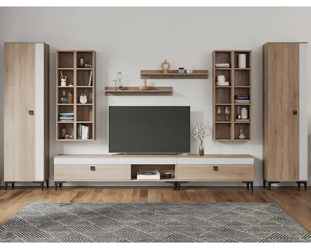 Living Scandinav Rafa 24 Un living in stil scandinav este aerisit, calduros, imbina texturi si materiale diverse si iti da o stare de relaxare, in aceasta categorie de mobilier se incadreza si setul de Living Scandinav Rafa 24. Aceasta colectie are un stil nordic si este alcatuita din mai multe corpuri. Puteti alege direct din configuratiile realizate de noi sau daca doriti puteti creea singuri propria configuratie de living combinand din corpurile de mobila pentru living astfel incat sa se potriveasca perfect in spatiul dorit. Livrare gratuita si rapida, 4-10 zile lucratoare prin flota proprie Suntem producatori de mobilier, fara intermediari Toate piesele de mobilier au o garantie de 2 ani Mobila Sufragerie stil nordic Corpurile sunt construite din PAL melaminat de 16mm cu finisaj alb si sonoma , cel din urma avand o textura similara lemnului, impreuna cu manerele si picioarele negre creeaza un contrast rafinat si un ambient placut. Cantul aplicat este unul de 0,6 ce le permite muchiilor sa fie placute la atingere . Dimensiuni Rafa 24 - Living Scandinav Imaginea alaturata prezinta compartimentarea pentru mobila de sufragerie Rafa. Aceasta configuratie are 10 corpuri modulare , 6 suspendate si 4 nesuspendate. Spatii de depozitare cu usa cat si etajere si polite. Dulapurile au bara de haine si 2 etajere. Dimensiuni corpuri componente: Comoda TV 1600: L 160 x A 33.5 x H 43.7 cm Comoda TV 1000: L 100 x A 33.5 x H 43.7 cm 4 x Corp decorarativ cu polite: L 120 x A 22 x H 25 cm Set 2 Polite Suspendate: L 91.8 x A 18.6 x H 12 cm 2 x Dulap de haine: L 51.6 x A 35.1 x H 192.4 cm Inaltime picioare 12cm, este inclusa in dimensiunile corpurilor si dimensiunea totala. Dimensiuni totale livin L 390 x A 35.1 x H 192.4 cm (inaltimea poate varia in functie de inaltimea pentru care optati atunci cand suspendati corpurile superioare) Spatiul de TV: diagonala recomandata maxima 180cm/70" Toate corpurile se pot pune pe stanga sau pe dreapta in functie de cum doriti. Nu este obligatoriu pozitionarea ca in prezentare. Ele nu sunt prinse unul de celalalt. Info si schite montaj mobila sufragerie Schite de montaj: DESCARCA SCHITA COMODA TV 1000 DESCARCA SCHITA COMODA TV 1600 DESCARCA SCHITA CORP DECORARATIV CU POLITE DESCARCA SCHITA POLITA DESCARCA SCHITA DULAP HAINE Pretul afisat nu include alte accesorii sau obiecte de decor (TV, tablouri, elemente de iluminat, covor etc.) Dimensiunile sunt exprimate in cm si pot oscila intre ± 10 mm. Produsul se livreaza demontat si este insotit de accesorii si instructiuni de asamblare. Produsul cu denumirea Rafa 24 - Living Scandinav face parte din brandul Mobila laguna, se afla in categoria Mobila living si sufragerii si subcategoria