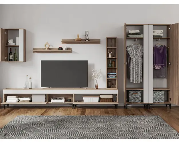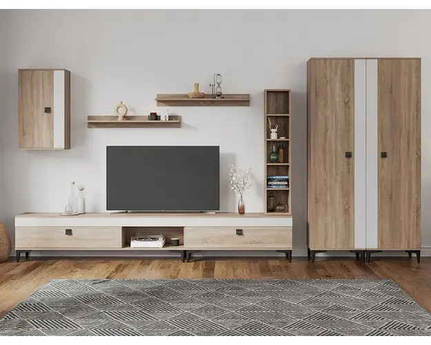 Living Scandinav Rafa 25 Un living in stil scandinav este aerisit, calduros, imbina texturi si materiale diverse si iti da o stare de relaxare, in aceasta categorie de mobilier se incadreza si setul de Living Scandinav Rafa 25. Aceasta colectie are un stil nordic si este alcatuita din mai multe corpuri. Puteti alege direct din configuratiile realizate de noi sau daca doriti puteti creea singuri propria configuratie de living combinand din corpurile de mobila pentru living astfel incat sa se potriveasca perfect in spatiul dorit. Livrare gratuita si rapida, 4-10 zile lucratoare prin flota proprie Suntem producatori de mobilier, fara intermediari Toate piesele de mobilier au o garantie de 2 ani Mobila Sufragerie stil nordic Corpurile sunt construite din PAL melaminat de 16mm cu finisaj alb si sonoma , cel din urma avand o textura similara lemnului, impreuna cu manerele si picioarele negre creeaza un contrast rafinat si un ambient placut. Cantul aplicat este unul de 0,6 ce le permite muchiilor sa fie placute la atingere . Dimensiuni Rafa 25 - Living Scandinav Imaginea alaturata prezinta compartimentarea pentru mobila de sufragerie Rafa. Aceasta configuratie are 8 corpuri modulare , 3 suspendate si 5 nesuspendate. Spatii de depozitare cu usa cat si etajere si polite. Dulapurile au bara de haine si etajere. Dimensiuni corpuri componente: Comoda TV 1600: L 160 x A 33.5 x H 43.7 cm Comoda TV 1000: L 100 x A 33.5 x H 43.7 cm Corp decorarativ cu polite: L 120 x A 22 x H 25 cm Corp Superior: L 43.9 x A 26.6 x H 77 cm Set 2 Polite Suspendate: L 91.8 x A 18.6 x H 12 cm 2 x Dulap de haine: L 51.6 x A 35.1 x H 192.4 cm Inaltime picioare 12cm, este inclusa in dimensiunile corpurilor si dimensiunea totala. Dimensiuni totale livin L 390 x A 35.1 x H 192.4 cm (inaltimea poate varia in functie de inaltimea pentru care optati atunci cand suspendati corpurile superioare) Spatiul de TV: diagonala recomandata maxima 180cm/70" Toate corpurile se pot pune pe stanga sau pe dreapta in functie de cum doriti. Nu este obligatoriu pozitionarea ca in prezentare. Ele nu sunt prinse unul de celalalt. Info si schite montaj mobila sufragerie Schite de montaj: DESCARCA SCHITA COMODA TV 1000 DESCARCA SCHITA COMODA TV 1600 DESCARCA SCHITA CORP SUPERIOR DESCARCA SCHITA CORP DECORARATIV CU POLITE DESCARCA SCHITA POLITA DESCARCA SCHITA DULAP HAINE Pretul afisat nu include alte accesorii sau obiecte de decor (TV, tablouri, elemente de iluminat, covor etc.) Dimensiunile sunt exprimate in cm si pot oscila intre ± 10 mm. Produsul se livreaza demontat si este insotit de accesorii si instructiuni de asamblare. Produsul cu denumirea Rafa 25 - Living Scandinav face parte din brandul Mobila laguna, se afla in categoria Mobila living si sufragerii si subcategoria
