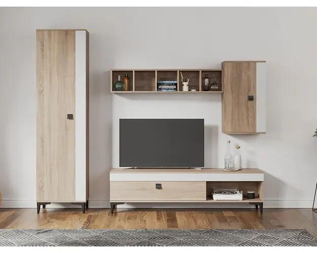 Living Scandinav Rafa 26 Un living in stil scandinav este aerisit, calduros, imbina texturi si materiale diverse si iti da o stare de relaxare, in aceasta categorie de mobilier se incadreza si setul de Living Scandinav Rafa 26. Aceasta colectie are un stil nordic si este alcatuita din mai multe corpuri. Puteti alege direct din configuratiile realizate de noi sau daca doriti puteti creea singuri propria configuratie de living combinand din corpurile de mobila pentru living astfel incat sa se potriveasca perfect in spatiul dorit. Livrare gratuita si rapida, 4-10 zile lucratoare prin flota proprie Suntem producatori de mobilier, fara intermediari Toate piesele de mobilier au o garantie de 2 ani Mobila Sufragerie stil nordic Corpurile sunt construite din PAL melaminat de 16mm cu finisaj alb si sonoma , cel din urma avand o textura similara lemnului, impreuna cu manerele si picioarele negre creeaza un contrast rafinat si un ambient placut. Cantul aplicat este unul de 0,6 ce le permite muchiilor sa fie placute la atingere . Dimensiuni Rafa 26 - Living Scandinav Imaginea alaturata prezinta compartimentarea pentru mobila de sufragerie Rafa. Aceasta configuratie are 4 corpuri modulare , 2 suspendate si 2 nesuspendate. Spatii de depozitare cu usa cat si etajere. Dulapul are bara de haine si etajere. Dimensiuni corpuri componente: Comoda TV 1600: L 160 x A 33.5 x H 43.7 cm Corp decorarativ cu polite: L 120 x A 22 x H 25 cm Corp Superior: L 43.9 x A 26.6 x H 77 cm Dulap de haine: L 51.6 x A 35.1 x H 192.4 cm Inaltime picioare 12cm, este inclusa in dimensiunile corpurilor si dimensiunea totala. Dimensiuni totale livin L 230 x A 35.1 x H 192.4 cm (inaltimea poate varia in functie de inaltimea pentru care optati atunci cand suspendati corpurile superioare) Spatiul de TV: diagonala recomandata maxima 180cm/70" Toate corpurile se pot pune pe stanga sau pe dreapta in functie de cum doriti. Nu este obligatoriu pozitionarea ca in prezentare. Ele nu sunt prinse unul de celalalt. Info si schite montaj mobila sufragerie Schite de montaj: DESCARCA SCHITA COMODA TV 1600 DESCARCA SCHITA CORP SUPERIOR DESCARCA SCHITA CORP DECORARATIV CU POLITE DESCARCA SCHITA DULAP HAINE Pretul afisat nu include alte accesorii sau obiecte de decor (TV, tablouri, elemente de iluminat, covor etc.) Dimensiunile sunt exprimate in cm si pot oscila intre ± 10 mm. Produsul se livreaza demontat si este insotit de accesorii si instructiuni de asamblare. Produsul cu denumirea Rafa 26 - Living Scandinav face parte din brandul Mobila laguna, se afla in categoria Mobila living si sufragerii si subcategoria