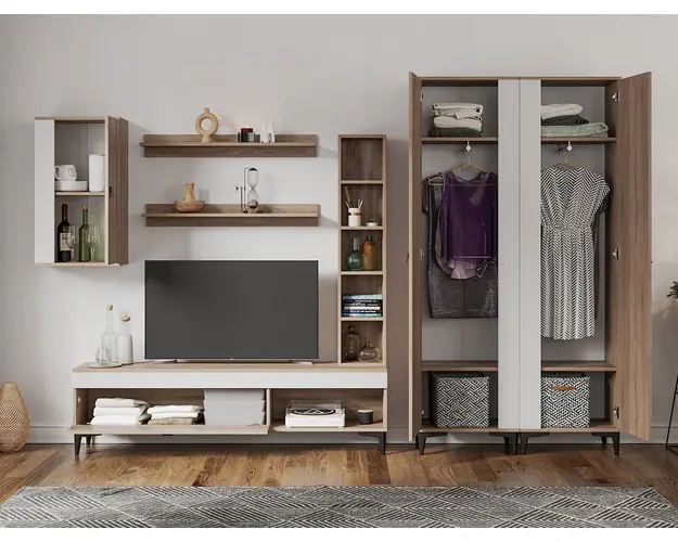Living Scandinav Rafa 29 Un living in stil scandinav este aerisit, calduros, imbina texturi si materiale diverse si iti da o stare de relaxare, in aceasta categorie de mobilier se incadreza si setul de Living Scandinav Rafa 29. Aceasta colectie are un stil nordic si este alcatuita din mai multe corpuri. Puteti alege direct din configuratiile realizate de noi sau daca doriti puteti creea singuri propria configuratie de living combinand din corpurile de mobila pentru living astfel incat sa se potriveasca perfect in spatiul dorit. Livrare gratuita si rapida, 4-10 zile lucratoare prin flota proprie Suntem producatori de mobilier, fara intermediari Toate piesele de mobilier au o garantie de 2 ani Mobila Sufragerie stil nordic Corpurile sunt construite din PAL melaminat de 16mm cu finisaj alb si sonoma , cel din urma avand o textura similara lemnului, impreuna cu manerele si picioarele negre creeaza un contrast rafinat si un ambient placut. Cantul aplicat este unul de 0,6 ce le permite muchiilor sa fie placute la atingere . Dimensiuni Rafa 29 - Living Scandinav Imaginea alaturata prezinta compartimentarea pentru mobila de sufragerie Rafa. Aceasta configuratie are 7 corpuri modulare , 3 suspendate si 4 nesuspendate. Spatii de depozitare cu usa cat si etajere si polite. Dulapurile au bara de haine si etajere. Dimensiuni corpuri componente: Comoda TV 1600: L 160 x A 33.5 x H 43.7 cm Corp decorarativ cu polite: L 120 x A 22 x H 25 cm Corp Superior: L 43.9 x A 26.6 x H 77 cm Set 2 Polite Suspendate: L 91.8 x A 18.6 x H 12 cm 2 x Dulap de haine: L 51.6 x A 35.1 x H 192.4 cm Inaltime picioare 12cm, este inclusa in dimensiunile corpurilor si dimensiunea totala. Dimensiuni totale livin L 310 x A 35.1 x H 192.4 cm (inaltimea poate varia in functie de inaltimea pentru care optati atunci cand suspendati corpurile superioare) Spatiul de TV: diagonala recomandata maxima 180cm/70" Toate corpurile se pot pune pe stanga sau pe dreapta in functie de cum doriti. Nu este obligatoriu pozitionarea ca in prezentare. Ele nu sunt prinse unul de celalalt. Info si schite montaj mobila sufragerie Schite de montaj: DESCARCA SCHITA COMODA TV 1600 DESCARCA SCHITA CORP SUPERIOR DESCARCA SCHITA CORP DECORARATIV CU POLITE DESCARCA SCHITA POLITA DESCARCA SCHITA DULAP HAINE Pretul afisat nu include alte accesorii sau obiecte de decor (TV, tablouri, elemente de iluminat, covor etc.) Dimensiunile sunt exprimate in cm si pot oscila intre ± 10 mm. Produsul se livreaza demontat si este insotit de accesorii si instructiuni de asamblare. Produsul cu denumirea Rafa 29 - Living Scandinav face parte din brandul Mobila laguna, se afla in categoria Mobila living si sufragerii si subcategoria