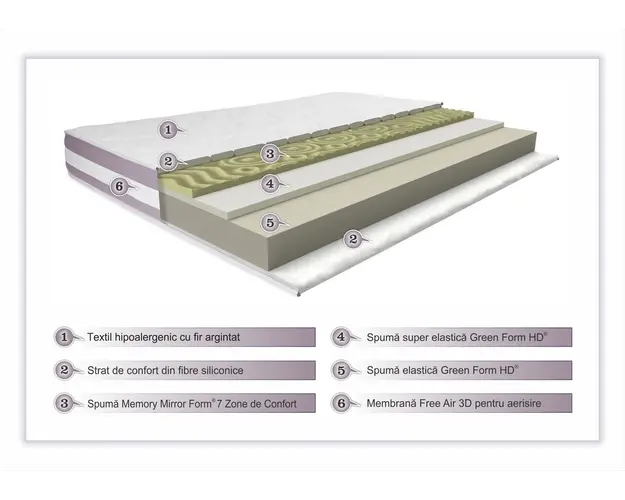 Impreuna cu specialisti ortopezi am creat pentru un somn sanatos, salteaua Argentum Healthguard Memory care combina calitatile ortopedice ale spumei elastice Green Form HD® cu cele termice si de confort ale spumei Green Therm Memory® Materiale de calitate superioara Husa este realizata din tesatura cu ioni de argint, moale la atingere, este matlasata pe partea superioara cu un strat generos de vatelina cu fibre naturale de bumbac certificata OEKO-TEX care imbunatateste confortul si aerisirea in timpul somnului. Baza saltelei din spuma elastica Green Form HD® cu celulatie deschisa asigura o sustinere anatomica a corpului si o pozitie corecta a coloanei fara dureri de spate in timpul somnului. Zona de confort a saltelei este formata din 2 straturi de spuma poliuretanica cu elasticitati diferite si functii complementare: 4 cm de spuma Green Therm Memory® care reactioneaza la caldura corpului si se muleaza pe acesta eliminand punctele de presiune in timpul somnului pentru a relaxa muschii si a asigura o circulatie sangvina sanatoasa; 3 cm de spuma super elastica Green Form HD® care actioneaza ca un strat intermediar de mini arcuri intre baza de suport al corpului si cel de memory. Are rolul de a imbunatati sustinerea corpului in zonele lombara, cervicala si a genunchilor. Tehnologia avansata a celor 3 spume HD de inalta calitate asigura un somn fara propagarea miscarilor partenerului. Efect antistatic: Capsulele cu ioni de argint ajuta la eliberarea tensiunilor acumulate in timpul zilei prin disiparea electricitatii statice. Proprietatile naturale hipoalergenice ale ionilor de argint, binecunoscute in medicina curenta, asigura o suprafata curata pentru un somn sanatos fara micro-organisme. Ventilatie Husa este prevazuta cu mesa 3D Free Air® pentru aerisire corespunzatoare si mentinerea unui mediu uscat si fara acarieni in timpul somnului. Dual confort! Salteaua poate fi utilizata pe ambele parti avand fermitati diferite: o parte foarte ferma cu strat de confort din fibre naturale de bumbac si o parte moale cu strat de confort format din spuma super-elastica si Memory. Structura: Spuma poliuretanica elastica cu celulatie deschisa Green Form HD® Spuma poliuretanica super-elastica cu celulatie deschisa Green Form HD® Spuma poliuretanica Green Therm Memory ® Husa cu ioni de argint Vatelina cu fibre de bumbac De ce sa cumperi salteaua Green Future Argentum 3D Healthguard Memory: Suport ortopedic Hipoalergenica Durabilitate Calitate Indicata pentru toate pozitiile de dormit: pe spate, pe lateral si pe stomac Inaltime saltea: 21 cm (+/-1 cm) Mod de ambalare: Vidata. Roluita Salteaua este vidata si roluita. Cititi cu atentie instructiunile de manevrare si despachetare. Pentru produsele infasurate in rulou, recomandam deschiderea/derularea imediat dupa achizitionare. Produsul cu denumirea Saltea Argentum Healthguard Memory 12+3+4 Ortopedica, Anatomica, Husa cu ioni de argint, Strat de confort cu nanofibra, Ventilatie 3D, 180x200 cm face parte din brandul Green future, se afla in categoria Mobila living si sufragerii si subcategoria