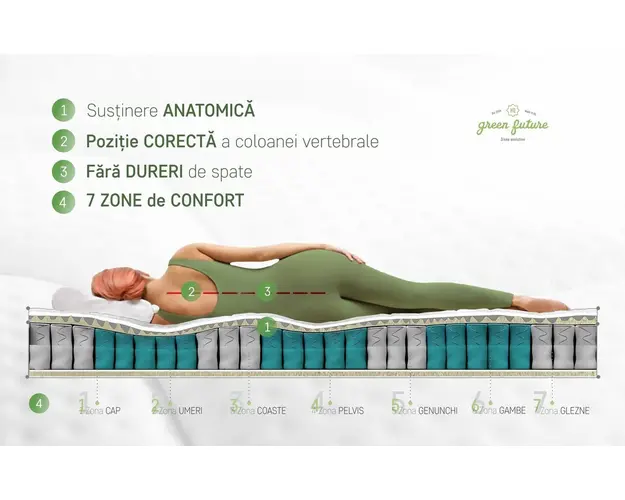 Alegerea saltelei potrivite se poate transforma intr-o misiune dificila. Cu cat ai mai multe optiuni si informatii, cu atat mai grea este alegerea. Pentru ca inteleg importanta acestui lucru, specialistii de la Green Future au dezvoltat Salteaua Endurance Pocket Memory 7 Zone de Confort, astfel incat decizia ta sa devina mult mai usoara. Iata de ce: Materiale de calitate superioara Salteaua Endurance Pocket Memory 7 Zone de Confort reprezinta combinatia optima intre calitatile ortopedice ale spumei elastice Green Form HD® cu cele termice ale spumei Memory Mirror Foam® si tehnologia arcurilor impachetate individual, 7Z Green Pocket®. Baza saltelei este formata din arcuri impachetate individual tip Pocket, sistemul preferat de specialistii din industria hoteliera pentru ca asigura o perioada extinsa de utilizare. Aceasta tehnologie ofera un nivel de confort avansat in timpul somnului actionand independent la presiunea exercitata asupra arcurilor si mulandu-se astfel perfect anatomic pe corp. Neavand legaturi intre ele, nu angreneaza in miscare celelalte arcuri oferind stabilitate ridicata. In plus, 7Z Green Pocket® permite un suport diferit al partilor corpului in functie de presiunea exercitata de acestea pe suprafata saltelei pentru a asigura o aliniere corecta si sanatoasa a vertebrelor coloanei. Sistemului 7Z Green Pocket® i se adauga spuma elastica Green Form HD® cu celulatie deschisa si 7 zone de confort ce asigura o pozitie naturala si corecta in timpul somnului, prevenind astfel durerile de spate sau cervicale. Husa Hipoalergenica din tricot de calitate superioara, moale la atingere, este matlasata cu fibre siliconice si 2 cm de spuma Memory Mirror Foam®. Stratul de spuma Memory Mirror Form® alaturi de tehnologia oferita de Green Form HD® impiedica propagarea miscarilor pe suprafata saltelei pentru a nu deranja partenerul in timpul somnului. In plus, spuma Memory Mirror Form® reactioneaza la caldura corpului si se muleaza pe acesta eliminand punctele de presiune in timpul somnului pentru a relaxa muschii si a asigura o circulatie a sangelui corespunzatoare. Salteaua Endurance Pocket Memory 7 Zone de Confort este prevazuta cu mesa Free AIR 3D ce asigura ventilatia optima in timpul utilizarii si ajuta la mentinerea unui mediu uscat in timpul somnului, impiedicand astfel formarea bacteriilor si a ciupercilor, principalii factori in dezvoltarea alergiilor. De ce sa cumperi Saltea Endurance Pocket Memory 7 Zone de Confort Suport ortopedic Confort termic Material Hipoalergenic Durabilitate Calitate Indicata ptr toate pozitiile de somn: pe spate, pe lateral si pe burta Structura: Sistem arcuri impachetate individual 7Z Green Pocket® Spuma poliuretanica elastica cu celulatie deschisa Green Form HD® Husa Hipoalergenica matlasata cu fibre siliconice si spuma Memory Mirror Form® Mesa Free AIR 3D® Caracteristici cheie: Ortopedica Hipoalergenica Confort termic Inaltime saltea: 30 cm (+/-1 cm) Mod de ambalare: Vidata. Roluita Salteaua este vidata si roluita. Cititi cu atentie instructiunile de manevrare si despachetare. Pentru produsele infasurate in rulou, recomandam deschiderea/derularea imediat dupa achizitionare. Produsul cu denumirea Saltea Endurance Pocket Memory 7 Zone de Confort H 30 cm 160x190 cm face parte din brandul Green future, se afla in categoria Mobila living si sufragerii si subcategoria
