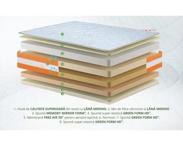 Bucura-te de un somn excelent tot timpul anului cu salteaua Green Future Wool 200x200 cm. Husa cu tesatura volumetrica cu adaos de fibre de lâna merinos, împreuna cu sistemul Free Air 3D si matlaseul din lâna merinos, asigura un confort termic pe tot parcursul anului. Salteaua a fost conceputa cu 2 fete de duritati diferite pentru ca tu sa dormi cum îti place: o fata mai moale cu spuma Memory si o fata super-ortopedica cu poliuretan super elastic. Structura saltelei a fost proiectata cu poliuretan de densitate înalta pentru o utilizare îndelungata si spuma super elastica ce ajuta la mentinerea coloanei într-o pozitie corecta în timpul somnului. Stratul de memory se muleaza pe corp asigurând o sustinere corecta a corpului. Salteaua Green Future Wool îndeplineste trei roluri esentiale pe care orice saltea de calitate superioara ar trebui sa le aiba. Primul rol este cel ortopedic. Acest rol ofera coloanei pozitia corecta si naturala menita sa faciliteze relaxarea încheieturilor. Functia anatomica are rolul de a va relaxa complet muschii pentru o circulatie sangvina sanatoasa. Al treilea rol pe care aceasta saltea îl îndeplineste este cel ergonomic, rol menit sa va asigure un confort sporit în timpul somnului. Structura saltea: Salteaua Green Future Wool este compusa din 4 parti, fiecare având grosimea si materialul perfect pentru confortul tau: 7 cm de poliuretan Green Therm Memory HD. 7 cm de poliuretan super elastic Green Form High Density. 5 cm de Poliuretan Elastic 4 cm de poliuretan super elastic Green Form High Density. Husa este realizata din tricot cu fibra de lâna merinos. Grosimea saltelei este de 24 cm (+/- 1 cm). Fabricat în România. Produsul cu denumirea Saltea Green Future Wool 200x200 cm - Lana Merinos face parte din brandul Green future, se afla in categoria Mobila living si sufragerii si subcategoria