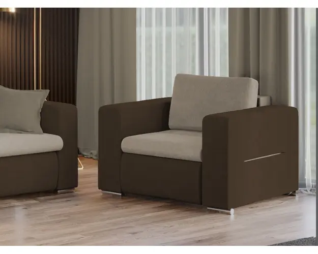 Set Canapea si Fotolii Ivy Crem / Maro Set Canapea si Fotolii Ivy Crem / Maro imbina doua nuante de stofa, iar picioarele argintii ofera un design elegant. Pe langa aspectul aparte, canapeaua este prevazuta cu lada, ideala pentru depozitarea lenjeriei, a pernelor sau a paturii si pentru a pastra la indemana toate articolele frecvent utilizate. Canapeaua se poate transforma intr-un pat confortabil cu suprafata utila 184 x 125 cm in doar cateva minute. Fotoliul are dimensiunea de: 85 cm lungime, 104 cm latime, 80 cm inaltime totala. Setul este tapitat cu stofa de calitate pe diverse culori. Atentie: Pretul afisat nu include alte accesorii sau obiecte de decor. Taburetele, pernele deco si draperiile se pot achizitiona optional. Livrare gratuita si rapida, 4-10 zile lucratoare prin flota proprie Suntem producatori de tapiterii, fara intermediari Toate piesele de tapiterii au o garantie de 2 ani Sezutul canapelei si al fotoliilor sunt din poliuretan de inalta densitate . Scheletul este rezistent, realizat pe structura solida de fag si pal. Extensia este de tip Doppelliege, ce prezinta un sistem actionat prin role, astfel ca partea de sezut se trage si permite partii de spatar sa gliseze spre partea din fata si sa se pozitioneze orizontal. SetulIvy Crem / Maro include canapeaua si cele doua fotolii si se incadreaza cu usurinta in majoritatea locuintelor indiferent de stilul acestora. Puteti alege din mai multe culori pentru stofa. Produsele disponibile le puteti vedea aici Modele Ivy . Dimensiuni Canapea Ivy Lungime: 235 cm Latime: 104 cm Lungime intre brate: 190 cm Inaltime sezut: 42 cm Adancime sezut: 90 cm Inaltime: 80 cm Inaltime brate: 65 cm Grosime brate: 20 cm Dimensiuni Extinsa: Lungime extinsa: 190 cm Adancime extinsa: 145 cm Dimensiuni Fotoliu Ivy Latime: 85 cm Adancime: 104 cm Inaltime: 80 cm Latime intre brate: 45 cm Adancime sezut: 90 cm Inaltime sezut: 42 cm Inaltime perna: 45 cm Grosime brate: 20 cm Tapiterie Set Canapea si Fotolii Ivy Tapiteria produselor este din stofa Crem si Maro . Nuantele acestui set nu sunt pretentioase, mascheaza eventualele evenimente neplacute prin care se pot murdari sau pata si se integreaza perfect in majoritatea locuintelor. Intretinere: se recomanda ca praful sa se stearga cu un material textil moale (finet) umed si sa nu se curete cu agenti chimici (diluant, acetona). Imaginile sunt cu titlu de prezentare si pot avea mici diferente de nuante in functie de display. Dimensiunile sunt exprimate in centimetri si pot oscila intre ± 50 mm. Produsul cu denumirea Set Canapea si Fotolii Ivy Crem / Maro face parte din brandul Mobila laguna, se afla in categoria Set canapele si fotolii si subcategoria