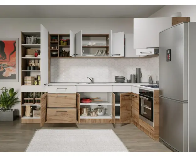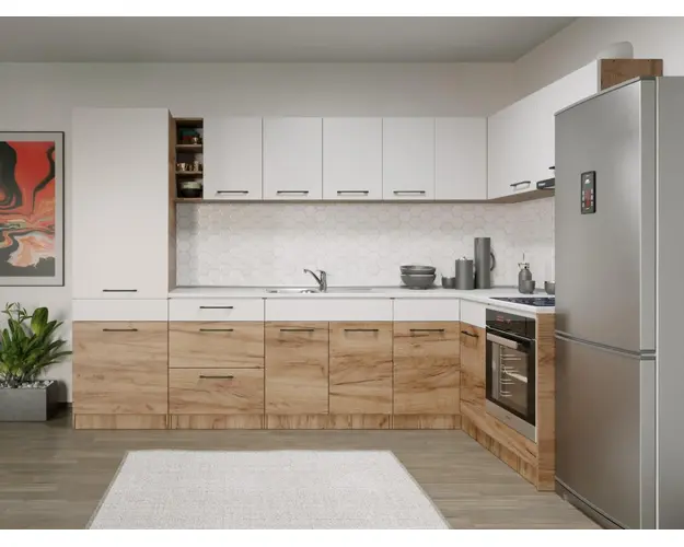 Set Mobila Bucatarie Colt Gastro 300*160 Alb/Stejar - C31
