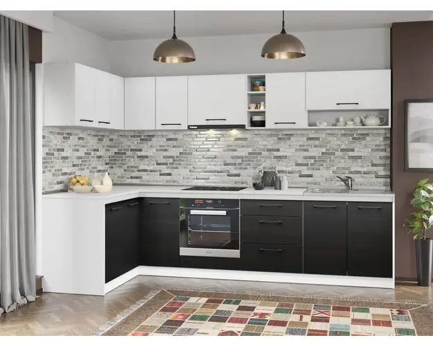 Set Mobila Bucatarie Colt Mina Yang 140*300 Ferrara/Alb C143 Acest set de mobila modulara pentru bucatarie, face parte din familia Mina . Corpurile sunt modulare si pot fi pozitionate in orice ordine doriti, de exemplu chiuveta in dreapta. Set Mobila Bucatarie Colt Mina Yang 140*300 Ferrara/Alb C143 este compus din urmatoarele corpuri: Corp Superior 400 L 40 x A 30.3 x H 55 cm Schita Montaj Corp Superior Colt L 100/100 x A 30.3 x H 55 cm Schita Montaj Corp Superior 600 Hota L 60 x A 30.3 x H 51.8 cm Schita Montaj Corp Superior 600 cu polite L 60 x A 30.3 x H 55 cm Schita Montaj Corp Superior 800 cu Nisa L 80 x A 30.3 x H 55 cm Schita Montaj Corp Inferior 400 L 40 x A 47.2 x H 82.5 cm Schita Montaj Corp Inferior Colt L 88.6/88.6 x A 47.2 x H 82.5 cm Schita Montaj Corp Inferior 600 cuptor L 60 x A 47.2 x H 82.5 cm Schita Montaj Corp Inferior 600 cu sertare L 60 x A 47.2 x H 82.5 cm Schita Montaj Corp Inferior 800 L 80 x A 47.2 x H 82.5 cm Schita Montaj Set 2 Pilastrii inferiori L 1.6 x A 58.6 x H 82 cm Setul este compartimentat cu polite si sertare. In costul acestei mobile de bucatarie sunt incluse urmatoarele componente : carcase/corpuri, fronturi usi, sertare, manere, polite, feronerie, pilastrii, talpi alunecatoare, blat 28mm (puteti alege si blat de 38mm). Dimensiuni maxime spatiu incastrare cuptor L 56.6 x A 55* x H 58 cm *Adancimea este data de blat, corpul este gol in spate si cuptorul poate iesi in adancime in spate cat este necesar. Nu sunt incluse si se pot cumpara optional: plinta antistrop, chiuveta, bateria, amortizoare usi si sertare (soft close), scurgatorul de vase, suport tacamuri sertar. Nu sunt incluse si nu sunt comercializate de noi: hota din inox aplicata, cuptor, cos evacuare hota, vesela si alte obiecte casnice. Alege corpurile dorite. Nu este necesara o plinta aplicata. Pentru usi si sertare. Contrast echilibrat si placut. Set Mobila Bucatarie Colt Mina Yang 140*300 Ferrara/Alb C143 Puteti alege intre doua grosimi de blat cu cant de PVC pe capete. Atentie blatul din dreapta de 164.2cm se continua cu chiuveta aplicata, aceasta vine in continuarea blatului, se fixeaza pe corpul de mobilier, nu se incastreaza in blat . Daca nu se bifeaza optiunea de chiuveta, blatul nu acopera toata lungimea corpurilor inferioare din dreapta . Puteti alege dimensiunea de 244.2cm pentru toata lungimea din partea dreapta si sa folositi si chiuveta incastrata. Pentru laterala dreapta blatul are lungimea de 144.2cm. Blat cu grosime de 28mm cu muchia frontala dreapta, material pal cu laminare, rezistent la abraziune Blat cu grosime de 38mm cu muchia frontala rotunjita, material pal cu laminare, rezistent la abraziune, rezistent la caldura / termorezistent Prinderea pe perete pentru corpurile superioare se face cu coltare metalice interioare.Elementele de prindere in perete ca diblu, conespan, holsurub nu sunt incluse deoarce tipul peretelui pe care urmeaza a se monta mobilierul poate fi divers (beton, caramida, BCA, rigips, lemn etc.). Latime: 144 cm stanga si 304 cm dreapta Adancime: 60 cm Inaltime: 200 cm Corpurile de bucatarie sunt construite din pal de 16mm cu finisaj Alb si Ferrara, carcasa este cu finisaj Alb, iar manerele sunt negre. Cantul aplicat de 0,6 le permite muchiilor sa fie placute la atingere fiind finisate si atent retusate. INFORMATII GENERALE MONTAJ BUCATARIE MINA Set Mobila Bucatarie Mina Livrare gratuita si fara surprize prin flota proprie Suntem producatori de mobilier Toate corpurile au o garantie de 2 ani Mobila Bucatarie Mina Familia Mina este o mobila de bucatarie cu stil realizata din corpuri modulare din material de PAL melaminat cu o compartimentare eficienta. Bucataria reprezinta o parte importanta din orice locuinta, camera cea mai frecventata de toti membrii familiei, de aceea ea trebuie sa fie creata din corpurile ce va sunt cele mai folositoare zi de zi. Fronturile au un design modern in 3 variante de nuante: Alb, Gri Antracit si Ferrara, carcasa este cu finisaj Alb, iar manerele sunt argintii sau negre . Pretul afisat nu include electrocasnicele sau obiecte de decor. Dimensiunile pot oscila intre ± 5 mm. Produsul se livreaza demontat si este insotit de accesorii si instructiuni de asamblare. Produsul cu denumirea Set Mobila Bucatarie Colt Mina Yang 140*300 Ferrara/Alb C143 face parte din brandul Mobila laguna, se afla in categoria Mobila de bucatarie si subcategoria