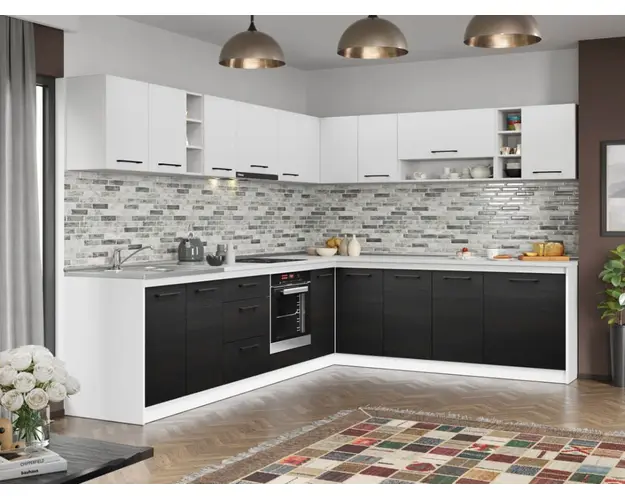 Set Mobila Bucatarie Colt Mina Yang 300*240 Ferrara/Alb C142 Acest set de mobila modulara pentru bucatarie, face parte din familia Mina . Corpurile sunt modulare si pot fi pozitionate in orice ordine doriti, de exemplu chiuveta in dreapta. Set Mobila Bucatarie Colt Mina Yang 300*240 Ferrara/Alb C142 este compus din urmatoarele corpuri: Corp Superior 800 L 80 x A 30.3 x H 55 cm Schita Montaj 2 x Corp Superior 600 cu polite L 60 x A 30.3 x H 55 cm Schita Montaj Corp Superior 600 Hota L 60 x A 30.3 x H 51.8 cm Schita Montaj Corp Superior Colt L 100/100 x A 30.3 x H 55 cm Schita Montaj Corp Superior 800 cu Nisa L 80 x A 30.3 x H 55 cm Schita Montaj 2 x Corp Inferior 800 L 80 x A 47.2 x H 82.5 cm Schita Montaj Corp Inferior 600 cu sertare L 60 x A 47.2 x H 82.5 cm Schita Montaj Corp Inferior 600 cuptor L 60 x A 47.2 x H 82.5 cm Schita Montaj Corp Inferior Colt L 88.6/88.6 x A 47.2 x H 82.5 cm Schita Montaj Corp Inferior 600 L 60 x A 47.2 x H 82.5 cm Schita Montaj Set 2 Pilastrii inferiori L 1.6 x A 58.6 x H 82 cm Setul este compartimentat cu polite si sertare. In costul acestei mobile de bucatarie sunt incluse urmatoarele componente : carcase/corpuri, fronturi usi, sertare, manere, polite, feronerie, pilastrii, talpi alunecatoare, blat 28mm (puteti alege si blat de 38mm). Dimensiuni maxime spatiu incastrare cuptor L 56.6 x A 55* x H 58 cm *Adancimea este data de blat, corpul este gol in spate si cuptorul poate iesi in adancime in spate cat este necesar. Nu sunt incluse si se pot cumpara optional: plinta antistrop, chiuveta, bateria, amortizoare usi si sertare (soft close), scurgatorul de vase, suport tacamuri sertar. Nu sunt incluse si nu sunt comercializate de noi: hota din inox aplicata, cuptor, cos evacuare hota, vesela si alte obiecte casnice. Alege corpurile dorite. Nu este necesara o plinta aplicata. Pentru usi si sertare. Contrast echilibrat si placut. Set Mobila Bucatarie Colt Mina Yang 300*240 Ferrara/Alb C142 Puteti alege intre doua grosimi de blat cu cant de PVC pe capete. Atentie blatul din stanga de 164.2 se continua cu chiuveta aplicata, aceasta vine in continuarea blatului, se fixeaza pe corpul de mobilier, nu se incastreaza in blat . Daca nu se bifeaza optiunea de chiuveta, blatul nu acopera toata lungimea corpurilor inferioare din stanga . Puteti alege dimensiunea de 244.2 pentru toata lungimea din partea stanga si sa folositi si chiuveta incastrata. Pentru laterala dreapta blatul are lungimea de 244.2. Blat cu grosime de 28mm cu muchia frontala dreapta, material pal cu laminare, rezistent la abraziune Blat cu grosime de 38mm cu muchia frontala rotunjita, material pal cu laminare, rezistent la abraziune, rezistent la caldura / termorezistent Prinderea pe perete pentru corpurile superioare se face cu coltare metalice interioare.Elementele de prindere in perete ca diblu, conespan, holsurub nu sunt incluse deoarce tipul peretelui pe care urmeaza a se monta mobilierul poate fi divers (beton, caramida, BCA, rigips, lemn etc.). Latime: 304 cm stanga si 244 cm dreapta Adancime: 60 cm Inaltime: 200 cm Corpurile de bucatarie sunt construite din pal de 16mm cu finisaj Alb si Ferrara, carcasa este cu finisaj Alb, iar manerele sunt negre. Cantul aplicat de 0,6 le permite muchiilor sa fie placute la atingere fiind finisate si atent retusate. INFORMATII GENERALE MONTAJ BUCATARIE MINA Set Mobila Bucatarie Mina Livrare gratuita si fara surprize prin flota proprie Suntem producatori de mobilier Toate corpurile au o garantie de 2 ani Mobila Bucatarie Mina Familia Mina este o mobila de bucatarie cu stil realizata din corpuri modulare din material de PAL melaminat cu o compartimentare eficienta. Bucataria reprezinta o parte importanta din orice locuinta, camera cea mai frecventata de toti membrii familiei, de aceea ea trebuie sa fie creata din corpurile ce va sunt cele mai folositoare zi de zi. Fronturile au un design modern in 3 variante de nuante: Alb, Gri Antracit si Ferrara, carcasa este cu finisaj Alb, iar manerele sunt argintii sau negre . Pretul afisat nu include electrocasnicele sau obiecte de decor. Dimensiunile pot oscila intre ± 5 mm. Produsul se livreaza demontat si este insotit de accesorii si instructiuni de asamblare. Produsul cu denumirea Set Mobila Bucatarie Colt Mina Yang 300*240 Ferrara/Alb C142 face parte din brandul Mobila laguna, se afla in categoria Mobila de bucatarie si subcategoria