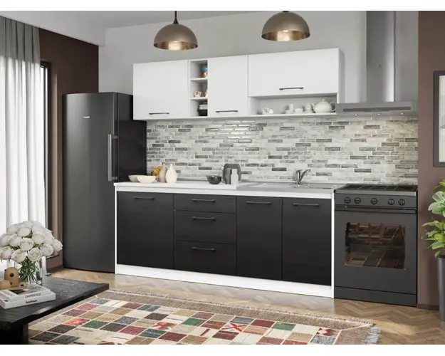 Set Mobila Bucatarie Mina Yang 200 Ferrara/Alb C122 Acest set de mobila modulara pentru bucatarie, face parte din familia Mina . Corpurile sunt modulare si pot fi pozitionate in orice ordine doriti, de exemplu chiuveta in stanga. Set Mobila Bucatarie Mina Yang 200 Ferrara/Alb C122 este compus din urmatoarele corpuri: Corp Superior 800 cu Nisa - L 80 x A 30.3 x H 55 cm - Schita Montaj Corp Superior 600 - L 60 x A 30.3 x H 55 cm - Schita Montaj Corp Superior 600 cu polite - L 60 x A 30.3 x H 55 cm - Schita Montaj Corp Inferior 800 - L 80 x A 47.2 x H 82.5 cm - Schita Montaj Corp Inferior 600 cu sertare - L 60 x A 47.2 x H 82.5 cm - Schita Montaj Corp Inferior 600 - L 60 x A 47.2 x H 82.5 cm - Schita Montaj Set 2 Pilastrii inferiori - L 1.6 x A 58.6 x H 82 cm Setul este compartimentat cu polite si sertare. In costul acestei mobile de bucatarie sunt incluse urmatoarele componente : carcase/corpuri, fronturi usi, sertare, manere, polite, feronerie, pilastrii, talpi alunecatoare, blat 28mm (puteti alege si blat de 38mm). Nu sunt incluse si se pot cumpara optional: plinta antistrop, chiuveta, bateria, amortizoare usi si sertare (soft close), scurgatorul de vase, suport tacamuri sertar. Nu sunt incluse si nu sunt comercializate de noi: hota din inox aplicata, cuptor, cos evacuare hota, vesela si alte obiecte casnice. Alege corpurile dorite. Nu este necesara o plinta aplicata. Pentru usi si sertare. Contrast echilibrat si placut. Set Mobila Bucatarie Mina Yang 200 Ferrara/Alb C122 Puteti alege intre doua grosimi de blat , cat si doua lungimi de 124.2 cm si 204.2 cu cant de PVC pe capete. Atentie blatul de 124.2 se continua cu chiuveta aplicata, aceasta vine in continuarea blatului, se fixeaza pe corpul de mobilier, nu se incastreaza in blat . Daca nu se bifeaza optiunea de chiuveta, blatul nu acopera toata lungimea corpurilor inferioare . Puteti alege dimensiunea de 204.2 pentru toata lungimea si sa folositi si chiuveta incastrata. Blat cu grosime de 28mm cu muchia frontala dreapta, material pal cu laminare, rezistent la abraziune Blat cu grosime de 38mm cu muchia frontala rotunjita, material pal cu laminare, rezistent la abraziune, rezistent la caldura / termorezistent Prinderea pe perete pentru corpurile superioare se face cu coltare metalice interioare.Elementele de prindere in perete ca diblu, conespan, holsurub nu sunt incluse deoarce tipul peretelui pe care urmeaza a se monta mobilierul poate fi divers (beton, caramida, BCA, rigips, lemn etc.). Latime: 204.2 cm Adancime: 60 cm Inaltime: 200 cm - aceasta poate varia in functie de inaltimea de suspendare dorita pentru corpurile superioare Corpurile de bucatarie sunt construite din pal de 16mm cu finisaj Alb si Ferrara, carcasa este cu finisaj Alb, iar manerele sunt negre. Cantul aplicat de 0,6 le permite muchiilor sa fie placute la atingere fiind finisate si atent retusate. INFORMATII GENERALE MONTAJ BUCATARIE MINA Set Mobila Bucatarie Mina Livrare gratuita si fara surprize prin flota proprie Suntem producatori de mobilier Toate corpurile au o garantie de 2 ani Mobila Bucatarie Mina Familia Mina este o mobila de bucatarie cu stil realizata din corpuri modulare din material de PAL melaminat cu o compartimentare eficienta. Bucataria reprezinta o parte importanta din orice locuinta, camera cea mai frecventata de toti membrii familiei, de aceea ea trebuie sa fie creata din corpurile ce va sunt cele mai folositoare zi de zi. Fronturile au un design modern in 3 variante de nuante: Alb, Gri Antracit si Ferrara, carcasa este cu finisaj Alb, iar manerele sunt argintii sau negre . Pretul afisat nu include electrocasnicele sau obiecte de decor. Dimensiunile pot oscila intre ± 5 mm. Produsul se livreaza demontat si este insotit de accesorii si instructiuni de asamblare. Produsul cu denumirea Set Mobila Bucatarie Mina Yang 200 Ferrara/Alb C122 face parte din brandul Mobila laguna, se afla in categoria Mobila de bucatarie si subcategoria