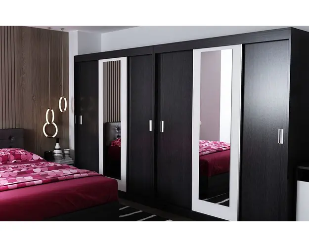 Set Mobila Dormitor Bingo F Dulap Dublu face parte din familia Bingo, acest set de mobila este format din mai multe piese la un pret avantajos. Corpurile sunt construite din PAL melaminat de 16mm cu finisaj Ferrara si Alb Mat, o textura similara lemnului, care creeaza un contrast rafinat si un ambient placut. Dimensiunea patului este la alegere 140×200, 160×200, 180×200 (spatiul pentru saltea) iar spatarul poate fi comandat netapitat, tapitat alb sau wenge .Cantul aplicat este unul de 0,6 care le permite muchiilor sa fie placute la atingere fiind finisate si atent retusate. Corpuri Set Mobila Dormitor Bingo F Dulap Dublu 2 x Dulap 3U glisante L 153 x A 55 x H 194.8cm Schita Montaj Compartimentate cu 14 polite si doua bare de umerase, cu oglinda aplicata pe usa. Pat matrimonial L 146, 166, 186 x A 203.2 x H 92cm Schita Pat 140 / Schita Pat 160 / Schita Pat 180 Suport de saltea inclus. Sustine pana la 300kg. Comoda L 67 x A 40.5 x H 71.7cm Schita Montaj Spatiu depozitare deschis si doua usi. Set noptiere L 44.4 x A 22.3 x H 32.5cm Schita Montaj Cu usa si spatiu generos. Livrare Gratuita prin flota proprie Suntem producatori de mobilier Toate corpurile au o garantie de 2 ani Pat dormitor 140, 160 sau 180 x 200 - Set Mobila Dormitor Bingo F Dulap Dublu Patul matrimonial mentine linia de design al setului de dormitor. Este rezistent cu sustinere in: repere de sustinere multiple 4 linii de sustinere pe latime si 3 pe lungime L-uri metalice pe colturi Latime: 203.2 cm Adancime: 186 cm sau 166 cm sau 146 cm (la alegere) Inaltime capat mare: 92 cm Inaltime capat mic: 34 cm Suport de saltea din pal brut inclus. Salteaua nu este inclusa! Bifati sus ca doriti. Saltea Compatibila 180×200 cm sau 160×200 cm sau 140×200 cm Atentie! Pretul afisat nu include salteaua si alte accesorii sau obiecte de decor (tablouri, elemente de iluminat, asternuturi, covor etc.) Dimensiunile pot oscila intre ± 10 mm. Produsul se livreaza demontat si este insotit de accesorii si instructiuni de asamblare. Produsul cu denumirea Set Mobila Dormitor Bingo F Dulap Dublu face parte din brandul Mobila laguna, se afla in categoria Seturi living si subcategoria