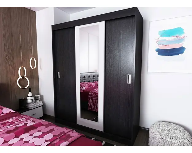 Set Mobila Dormitor Bingo F Tapitat Wenge face parte din familia Bingo, acest set de mobila este format din mai multe piese la un pret avantajos. Corpurile sunt construite din PAL melaminat de 16mm cu finisaj Ferrara si Alb Mat, o textura similara lemnului, care creeaza un contrast rafinat si un ambient placut. Dimensiunea patului este la alegere 140×200, 160×200, 180×200 (spatiul pentru saltea) iar spatarul poate fi comandat netapitat, tapitat alb sau wenge .Cantul aplicat este unul de 0,6 care le permite muchiilor sa fie placute la atingere fiind finisate si atent retusate. Corpuri Set Mobila Dormitor Bingo F Tapitat Wenge Dulap 3U glisante L 153 x A 55 x H 194.8cm Schita Montaj Compartimentat cu 7 polite si bara de umerase, cu oglinda aplicata pe usa. Pat matrimonial Tapitat L 146, 166, 186 x A 203.2 x H 92cm Schita Pat 140 / Schita Pat 160 / Schita Pat 180 Suport de saltea inclus. Sustine pana la 300kg. Comoda L 67 x A 40.5 x H 71.7cm Schita Montaj Spatiu depozitare deschis si doua usi. Set noptiere L 44.4 x A 22.3 x H 32.5cm Schita Montaj Cu usa si spatiu generos. Livrare Gratuita prin flota proprie Suntem producatori de mobilier Toate corpurile au o garantie de 2 ani Pat dormitor 140, 160 sau 180 x 200 Tapiteria poate fi alba sau wenge, la alegere. Patul matrimonial mentine linia de design al setului de dormitor Bingo F Tapitat Wenge. Este rezistent cu sustinere in: repere de sustinere multiple 4 linii de sustinere pe latime si 3 pe lungime L-uri metalice pe colturi Latime: 203.2 cm Adancime: 186 cm sau 166 cm sau 146 cm (la alegere) Inaltime capat mare: 92 cm Inaltime capat mic: 34 cm Suport de saltea din pal brut inclus. Salteaua nu este inclusa! Bifati sus ca doriti. Saltea Compatibila 180×200 cm sau 160×200 cm sau 140×200 cm Atentie! Pretul afisat nu include salteaua si alte accesorii sau obiecte de decor (tablouri, elemente de iluminat, asternuturi, covor etc.) Dimensiunile pot oscila intre ± 10 mm. Produsul se livreaza demontat si este insotit de accesorii si instructiuni de asamblare. Produsul cu denumirea Set Mobila Dormitor Bingo F Tapitat Wenge face parte din brandul Mobila laguna, se afla in categoria Seturi living si subcategoria