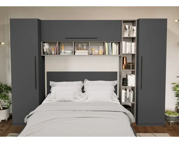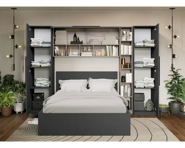 Set Dormitor Noce 2.84m cu pat incadrat Ideal pentru camere mici sau care vor sa economiseasca spatiu. Corpurile din Set Dormitor Noce 2.84m cu pat incadrat sunt spatioase si indeplinesc atat un rol estetic, cat si unul functional desavarsit. Finisajul gri antracit in combinatie cu stejarul k02 si manerele negre creeaza un ambient modern si relaxant. Include pat 140x200, corp suprapozabil suspendat deasupra patului si dulapuri laterale . Dimensiunea peretelui pe care se poate pozitiona este de minim 2.84m . Dormitorul este compus din: 2 x Dulap 0.51m - L 51 x A 53 x H 199cm - Schita Montaj Corp Polite 0.28m L 28 x A 33.6 x H 199cm Schita Montaj Corp Suprapozabil - L 154 x A 30.4 x H 69 cm - Schita Montaj Compartimentate cu 10 polite inchise si 11 deschise. Pat matrimonial L 151.4 x A 211 x H 95cm Schita Montaj Suport de saltea inclus. Sustine pana la 300kg. Set 2 sertare fata (optional) - L 103 x A 69.4 x H 28.7cm - Schita Montaj Poti alege 2 lazi pentru depozitare. Livrare Gratuita prin flota proprie Suntem producatori de mobilier Toate corpurile au o garantie de 2 ani Video de prezentare familie Videoul de prezentare poate contine mai multe corpuri de mobilier sau mai putine in comparatie cu produsul de pe aceasta pagina. Scopul acestui video este de a detalia aspectul materialelor, accesoriilor cat si a familiei din care face parte. Set Dormitor Noce 2.84m cu pat incadrat Se pot pune 2 sertare de depozitare in fata pe stanga si dreapta. Este rezistent cu sustinere in mai multe elemente: puncte de sprijin pe doua axe, 2 linii de sustinere pe lungime/laterale + 1 T central, L-uri metalice pe colturi Dimensiuni Pat Gri Latime: 151.4 cm Adancime: 211 cm Inaltime capat mare: 95 cm Inaltime capat mic: 36.8 cm Spatiu incadrament saltea: 7 cm (cat intra salteaua in cadru) Spatiu de la suport saltea la pardoseala: 30.5 cm Suportul de saltea din pal brut este inclus in pret. Saltea Compatibila 140×200 cm. Salteaua nu este inclusa! Bifati sus ca doriti. Alege 2 lazi pentru depozitare Sporeste utilitatea patului prin lazile de depozitare. Reperul de jos este din pal de 16mm ce ofera o rezistenta sporita. Nu necesita fixarea pe cadrul patului, sunt pe roti si culiseaza sub pat iar frontul sertarului se opreste in laterala patului mascand spatiul de sub pat. Pot fi puse 2 sertare. Dimensiune 1 sertar: 28.7 cm x 103 cm x 69.4 cm. Set Dormitor Noce 2.84m cu pat incadrat Face parte din familia de mobila pentru dormitor Noce . Mobileaza un dormitor rapid si usor. Corpurile din Set Dormitor Noce 2.84m cu pat incadrat sunt realizate din PAL melaminat cu finisaj gri antracit si stejar k02 , o textura similara lemnului, care creeaza un contrast rafinat si un ambient placut. Cantul aplicat este unul de 0,6 ce le permite muchiilor sa fie placute la atingere fiind finisate si atent retusate. Pretul afisat nu include alte accesorii sau obiecte de decor (tablouri, elemente de iluminat, asternuturi, covor etc.) Produsul se livreaza demontat si este insotit de accesorii si instructiuni de asamblare. Dimensiunile sunt exprimate in cm si pot oscila intre ± 10 mm. Produsul cu denumirea Set Mobila Dormitor Noce 2.84m cu pat incadrat face parte din brandul Mobila laguna, se afla in categoria Seturi living si subcategoria