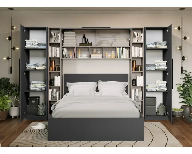 Set Dormitor Noce 3.12m cu pat incadrat Ideal pentru camere mici sau care vor sa economiseasca spatiu. Corpurile din Set Dormitor Noce 3.12m cu pat incadrat sunt spatioase si indeplinesc atat un rol estetic, cat si unul functional desavarsit. Finisajul gri antracit in combinatie cu stejarul k02 si manerele negre creeaza un ambient modern si relaxant. Include pat 140x200, corp suprapozabil suspendat deasupra patului si dulapuri laterale . Dimensiunea peretelui pe care se poate pozitiona este de minim 3.12m . Dormitorul este compus din: 2 bucati x Dulap 0.51m - L 51 x A 53 x H 199cm - Schita Montaj 2 bucati x Corp Polite 0.28m - L 28 x A 33.6 x H 199cm - Schita Montaj Corp Suprapozabil - L 154 x A 30.4 x H 69 cm - Schita Montaj Compartimentate cu 10 polite inchise, 17 deschise. Pat matrimonial L 151.4 x A 211 x H 95cm Schita Montaj Suport de saltea inclus. Sustine pana la 300kg. Set 2 sertare fata (optional) - L 103 x A 69.4 x H 28.7cm - Schita Montaj Poti alege 2 lazi pentru depozitare. Livrare Gratuita prin flota proprie Suntem producatori de mobilier Toate corpurile au o garantie de 2 ani Video de prezentare familie Videoul de prezentare poate contine mai multe corpuri de mobilier sau mai putine in comparatie cu produsul de pe aceasta pagina. Scopul acestui video este de a detalia aspectul materialelor, accesoriilor cat si a familiei din care face parte. Set Dormitor Noce 3.12m cu pat incadrat Se pot pune 2 sertare de depozitare in fata pe stanga si dreapta. Este rezistent cu sustinere in mai multe elemente: puncte de sprijin pe doua axe, 2 linii de sustinere pe lungime/laterale + 1 T central, L-uri metalice pe colturi Dimensiuni Pat Gri Latime: 151.4 cm Adancime: 211 cm Inaltime capat mare: 95 cm Inaltime capat mic: 36.8 cm Spatiu incadrament saltea: 7 cm (cat intra salteaua in cadru) Spatiu de la suport saltea la pardoseala: 30.5 cm Suportul de saltea din pal brut este inclus in pret. Saltea Compatibila 140×200 cm. Salteaua nu este inclusa! Bifati sus ca doriti. Alege 2 lazi pentru depozitare Sporeste utilitatea patului prin lazile de depozitare. Reperul de jos este din pal de 16mm ce ofera o rezistenta sporita. Nu necesita fixarea pe cadrul patului, sunt pe roti si culiseaza sub pat iar frontul sertarului se opreste in laterala patului mascand spatiul de sub pat. Pot fi puse 2 sertare. Dimensiune 1 sertar: 28.7 cm x 103 cm x 69.4 cm. Set Dormitor Noce 3.12m cu pat incadrat Face parte din familia de mobila pentru dormitor Noce . Mobileaza un dormitor rapid si usor. Corpurile din Set Dormitor Noce 3.12m cu pat incadrat sunt realizate din PAL melaminat cu finisaj gri antracit si stejar k02 , o textura similara lemnului, care creeaza un contrast rafinat si un ambient placut. Cantul aplicat este unul de 0,6 ce le permite muchiilor sa fie placute la atingere fiind finisate si atent retusate. Pretul afisat nu include alte accesorii sau obiecte de decor (tablouri, elemente de iluminat, asternuturi, covor etc.) Produsul se livreaza demontat si este insotit de accesorii si instructiuni de asamblare. Dimensiunile sunt exprimate in cm si pot oscila intre ± 10 mm. Produsul cu denumirea Set Mobila Dormitor Noce 3.12m cu pat incadrat face parte din brandul Mobila laguna, se afla in categoria Seturi living si subcategoria