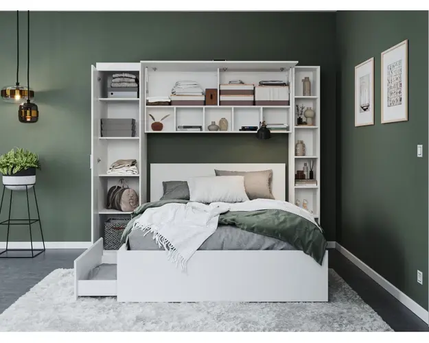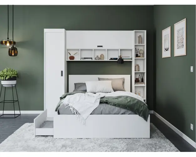Set Dormitor Nordis 2.26m cu pat incadrat Ideal pentru camere mici sau pentru care se doreste economisirea spatiului. Corpurile din Set Dormitor Nordis 2.26m cu pat incadrat sunt spatioase si indeplinesc atat un rol estetic, cat si unul functional desavarsit. Finisajul alb creeaza un ambient modern si atractiv in combinatie cu manerele negre. Include pat 140x200, corp suprapozabil suspendat deasupra patului si dulapuri laterale . Dimensiunea peretelui pe care se poate pozitiona este de minim 2.26m . Dormitorul este compus din Dulap Soldat - L 44.4 x A 55 x H 194.8cm - Schita Montaj cu deschidere clasica pe balamale Dulap cu polite - L 28 x A 33.6 x H 194.8 cm - Schita Montaj Corp Suprapozabil - L 154 x A 30.4 x H 69 cm - Schita Montaj Compartimentate cu 7 polite inchise, 11 deschise. Pat matrimonial L 151.4 x A 211 x H 95cm Schita Montaj Suport de saltea inclus. Sustine pana la 300kg. Set 2 sertare fata (optional) - L 103 x A 69.4 x H 28.7cm - Schita Montaj Poti alege 2 lazi pentru depozitare. Livrare Gratuita prin flota proprie Suntem producatori de mobilier Toate corpurile au o garantie de 2 ani Video de prezentare familie Videoul de prezentare poate contine mai multe corpuri de mobilier sau mai putine in comparatie cu produsul de pe aceasta pagina. Scopul acestui video este de a detalia aspectul materialelor, accesoriilor cat si a familiei din care face parte. Dormitor Nordis 2.26m cu pat incadrat Se pot pune 2 sertare de depozitare in fata pe stanga si dreapta. Este rezistent cu sustinere in mai multe elemente: puncte de sprijin pe doua axe, 2 linii de sustinere pe lungime/laterale + 1 T central, L-uri metalice pe colturi Dimensiuni Pat Alb Latime: 151.4 cm Adancime: 211 cm Inaltime capat mare: 95 cm Inaltime capat mic: 36.8 cm Spatiu incadrament saltea: 7 cm (cat intra salteaua in cadru) Spatiu de la suport saltea la pardoseala: 30.5 cm Suportul de saltea din pal brut este inclus in pret. Saltea Compatibila 140×200 cm. Salteaua nu este inclusa! Bifati sus ca doriti. Alege 2 lazi pentru depozitare Sporeste utilitatea patului prin lazile de depozitare. Reperul de jos este din pal de 16mm ce ofera o rezistenta sporita. Nu necesita fixarea pe cadrul patului, sunt pe roti si culiseaza sub pat iar frontul sertarului se opreste in laterala patului mascand spatiul de sub pat. Pot fi puse 2 sertare. Dimensiune 1 sertar: 28.7 cm x 103 cm x 69.4 cm. Set Dormitor pat incadrat Face parte din familia de mobila pentru dormitor Nordis . O solutie ideala pentru un dormitor matrimonial. Corpurile din Set Dormitor Nordis 2.26m cu pat incadrat sunt realizate din PAL melaminat cu finisaj Alb, care creeaza un spatiu rafinat si un ambient placut. Cantul aplicat este unul de 0,6 ce le permite muchiilor sa fie placute la atingere fiind finisate si atent retusate. Pretul afisat nu include alte accesorii sau obiecte de decor (tablouri, elemente de iluminat, asternuturi, covor etc.) Produsul se livreaza demontat si este insotit de accesorii si instructiuni de asamblare. Dimensiunile sunt exprimate in cm si pot oscila intre ± 10 mm. Produsul cu denumirea Set Mobila Dormitor Nordis 2.26m cu pat incadrat face parte din brandul Mobila laguna, se afla in categoria Seturi living si subcategoria