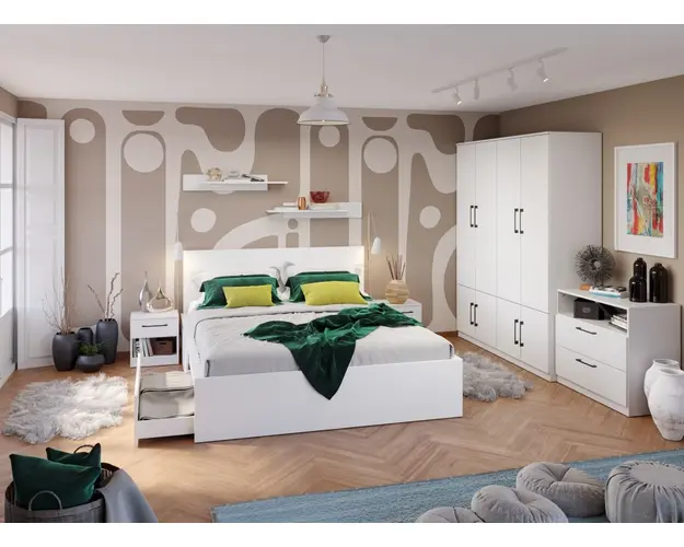 Set Dormitor Snow C14 Un dormitor matrimonial versatil ce doreste sa bifeze toate cerintele unui mobilier ideal. Set Dormitor Snow C14 are un aspect modern, combinand palul alb cu manerele negre, ce mentine linii drepte si clare in design. Dulapul are dimensiuni generoase, este spatios, iar inaltimea este conceputa cat sa incapa si in camere mai putin inalte sau in mansarde. Pe langa dulap, comoda, noptierele si patul ofera la randul lor spatii de depozitarea prin sertare . Deasemenea puteti alege seturi cu pat cudimensiuni de 140, 160, 180×200.Aveti posibilitatea de a adauga doua sau patru lazi de depozitare. Corpuri Set Dormitor Snow C14 Dulap 1.64m cu usi L 164.4 x A 48 x H 192.5cm Schita Montaj Compartimentat cu 6 polite si bara umerase. Pat matrimonial L 151.4, 171.4, 191.4 x A 211 x H 95cm Schita Montaj Suport de saltea inclus. Sustine pana la 300kg. Set sertare/lada pat (optional) L 103 x A 69.4 x H 28.7cm Schita Montaj Poti alege 2 sau 4 sertare/lazi pentru depozitare Set noptiere L 39 x A 30.4 x H 41.5cm Schita Montaj Cu sertare si spatiu generos. Comoda L 83 x A 42.3 x H 71.7cm Schita Montaj Spatiu depozitare deschis si doua sertare. Set polite albe suspendate (optional) L 92 x A 16.1 x H 14.5 cm Schita Montaj Livrare Gratuita prin flota proprie Suntem producatori de mobilier Toate corpurile au o garantie de 2 ani Video de prezentare familie Videoul de prezentare poate contine mai multe corpuri de mobilier sau mai putine in comparatie cu produsul de pe aceasta pagina. Scopul acestui video este de a detalia aspectul materialelor, accesoriilor cat si a familiei din care face parte. Pat Alb Set Dormitor Snow C14 Se pot pune 2 sau 4 sertare de depozitare. Este rezistent cu sustinere in mai multe elemente: puncte de sprijin pe doua axe, 2 linii de sustinere pe lungime/laterale + 1 T central, L-uri metalice pe colturi Dimensiuni Pat Alb Latime: 151.4 cm sau 171.4 cm sau 191.4 cm (la alegere) Adancime: 211 cm Inaltime capat mare: 95 cm Inaltime capat mic: 36.8 cm Spatiu incadrament saltea: 7 cm (cat intra salteaua in cadru) Spatiu de la suport saltea la pardoseala: 30.5 cm Suportul de saltea din pal brut este inclus in pret. Saltea Compatibila 180×200 cm, 160×200 cm sau 140×200 cm in functie de dimensiunea de pat aleasa. Salteaua nu este inclusa! Bifati sus ca doriti. Alege 2 sau 4 lazi pentru depozitare Sporeste utilitatea patului prin lazile de depozitare. Reperul de jos este din pal de 16mm ce ofera o rezistenta sporita. Nu necesita fixarea pe cadrul patului, sunt pe roti si culiseaza sub pat iar frontul sertarului se opreste in laterala patului mascand spatiul de sub pat. Pot fi puse pana la 4 sertare. Dimensiune 1 sertar: 28.7 cm x 103 cm x 69.4 cm. Set Dormitor Snow C14 Face parte din familia de mobila pentru dormitor Snow . O solutie ideala pentru un dormitor matrimonial. Corpurile din Set Dormitor Snow C14 sunt realizate din PAL melaminat cu finisaj Alb care creeaza un spatiu rafinat si un ambient placut. Cantul aplicat este unul de 0,6 ce le permite muchiilor sa fie placute la atingere fiind finisate si atent retusate. Pretul afisat nu include alte accesorii sau obiecte de decor (tablouri, elemente de iluminat, asternuturi, covor etc.) Produsul se livreaza demontat si este insotit de accesorii si instructiuni de asamblare. Dimensiunile sunt exprimate in cm si pot oscila intre ± 10 mm. Produsul cu denumirea Set Mobila Dormitor Snow C14 face parte din brandul Mobila laguna, se afla in categoria Seturi living si subcategoria