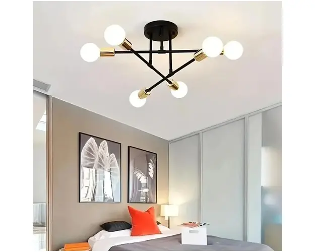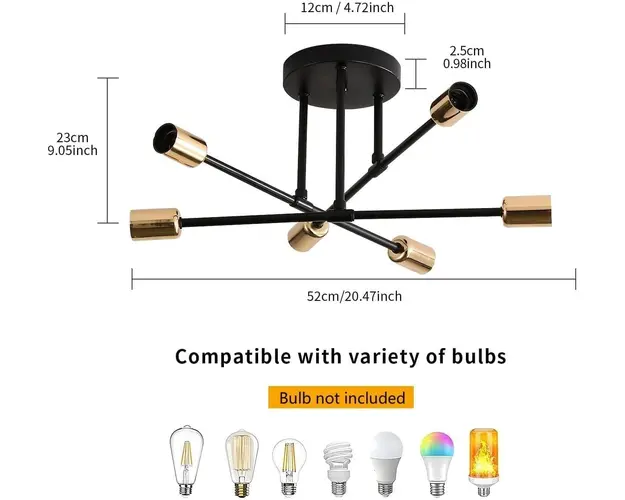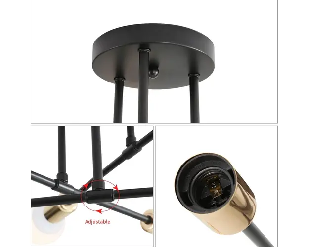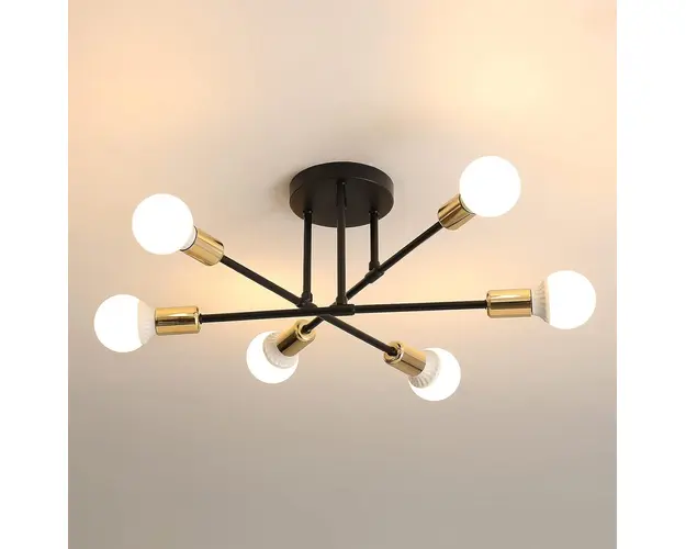 Lustra Techstar® BG06 Negru Mat cu Auriu Satinat, Baze E27 cu 6 Lumini Design Industrial Minimalist, Ideala pentru Iluminatul Interior Modern