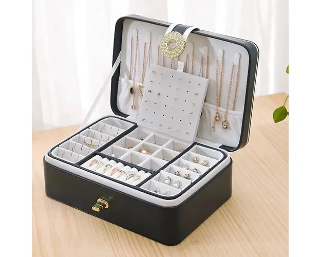 2 compartimente principale; 8 agatatori pentru coliere/bratari; 15 compartimente bijuterii; 7 compartimente inele/cercei; 11 suporturi pentru cercei; 2 pernute suport pentru ceasuri; Material: piele ecologica; Dimensiune: 23.5 x 16 x 9 cm. Important : Culoarea produsului poate varia usor datorita luminozitatii monitorului. Din cauza varietatii instrumentelor de masura, pot exista usoare erori de cm. Produsul cu denumirea Cutie pentru bijuterii, Adeluna AC017, Roz face parte din brandul , se afla in categoria Bijuterii argint dama si subcategoria