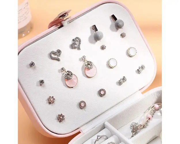 6 compartimente inele/cercei; 3 compartimente pentru bratari si coliere; 5 agatatori pentru bratari sau coliere; 1 suport cercei; Material: piele ecologica; Dimensiune: 16 x 11 x 5 cm. Important : Culoarea produsului poate varia usor datorita luminozitatii monitorului. Din cauza varietatii instrumentelor de masura, pot exista usoare erori de cm. Produsul cu denumirea Cutie pentru bijuterii, Hesperia AC027, Alb/Albastru face parte din brandul , se afla in categoria Bijuterii argint dama si subcategoria