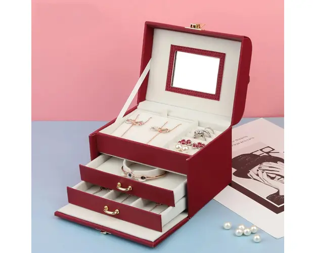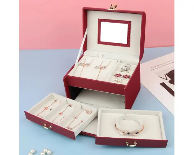 5 compartimente inele/cercei; 2 sertare pentru bratari si coliere; 1 suport pentru bratari sau coliere; capac cu oglinda; Material: piele ecologica; Dimensiune: 15 x 11.6 x 11.5 cm. Important : Culoarea produsului poate varia usor datorita luminozitatii monitorului. Din cauza varietatii instrumentelor de masura, pot exista usoare erori de cm. Produsul cu denumirea Cutie pentru bijuterii, Xylia AC013, Bordo face parte din brandul , se afla in categoria Bijuterii argint dama si subcategoria
