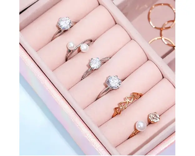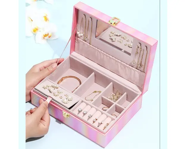 6 compartimente inele/cercei; 4 agatatori pentru coliere/bratari; 6 compartimente bijuterii; 1 suport pentru cercei; capac cu oglinda; Material: piele ecologica; Dimensiune: 22 x 16 x 7.5 cm. Important : Culoarea produsului poate varia usor datorita luminozitatii monitorului. Din cauza varietatii instrumentelor de masura, pot exista usoare erori de cm. Produsul cu denumirea Cutie pentru bijuterii, Ysabel AC014, Roz face parte din brandul , se afla in categoria Bijuterii argint dama si subcategoria