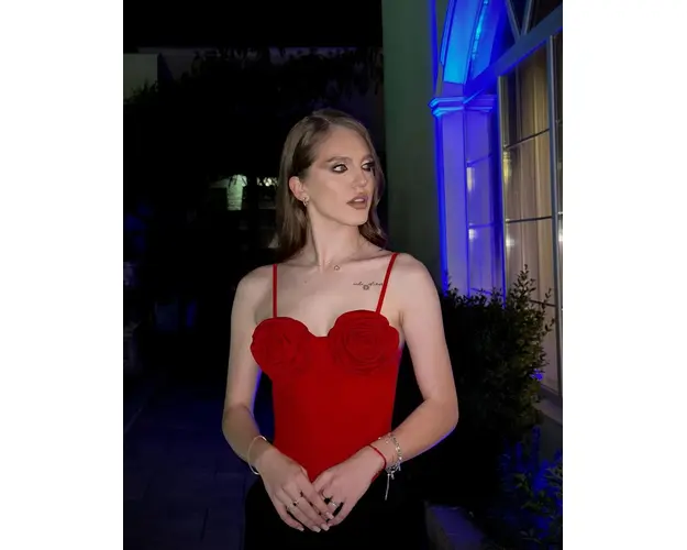 Topul Rosa este foarte elegant si distinctiv, cu bretele subtiri si un design neobisnuit, care se remarca prin doua aplicatii florale mari, plasate deasupra bustului. Aceste flori 3D adauga un aer romantic si sofisticat. Croiala este tip corset, ceea ce confera o silueta bine definita si pune accent pe talie. Materialul pare sa fie neted si structurat, completand designul rafinat si modern. Topul are un stil extravagant si este potrivit pentru un eveniment deosebit sau o ocazie speciala.Caracteristici:Compozitie: stofa (97% poly 3% el)Inchidere corset cu snurInformatii Suplimentare La Telefon.Produse Realizate in Atelierul GLAMO. Produsul cu denumirea Rosa Corset Top Rosu face parte din brandul , se afla in categoria Tricouri si subcategoria