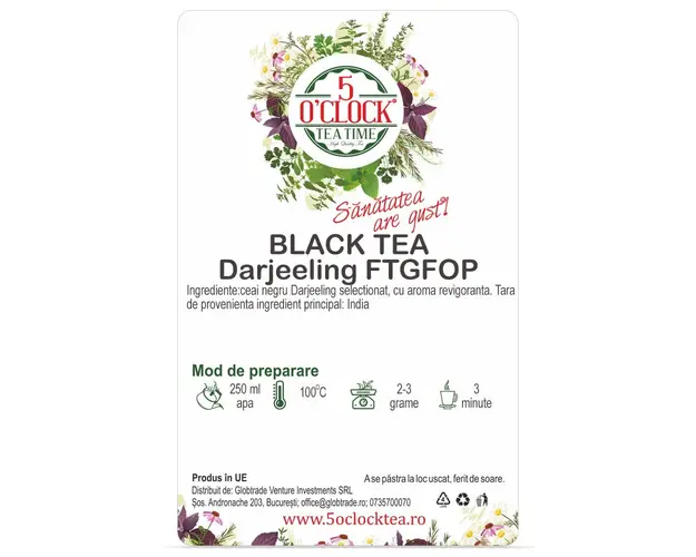 Ce face ca infuzia de ceai negru Darjeeling sa fie atat de speciala? In primul rand faptul ca este cultivat numai in zonele din districtul Darjeeling, in Bengalul de Vest, India. Doar ceaiul negru care provine din aceasta zona poate fi numit astfel. Te invitam la o ceasca de Darjeeling FTGFOP First flush, un sortiment de calitate premium ce prezinta o infuzie cu totul deosebita, demna de o "sampanie a ceaiurilor", asa cum este supranumit acest sortiment de ceai. In prezent, ceaiul negru Darjeeling este recunoscut ca fiind unul dintre cele mai scumpe si mai fine ceaiuri din lume, datorita aromei sale desavarsite, ce nu poate fi reprodusa. Buchetul unic al acestui ceai este rezultatul conditiilor naturale caracteristice zonei Darjeeling: se cultiva la o altitudine de 750-2000 m, intr-un climat rece si umed, in soluri ce se bucura de drenaj natural, in care alterneaza ploile intermitente, soarele si ceata. Ingrediente: ceai negru selectionat, cu aroma revigoranta. Tara de provenienta a ingredientului principal: India. Produs in UE. Merge cu: branza, miel, prajituri. Recomandari de servire: Intrucat ceaiul negru are un gust mai puternic, poti adauga in ceai o cantitate foarte mica de lapte. Mod de Preparare: Pentru prepararea unei cesti de ceai, adaugati apa fierbinte ( 100C) peste o lingurita cu ceai (aproximativ 2 gr) si lasati la infuzat timp de 3 minute. Dozaj portie 2 grame Temperatura apa 100C Timp de preparare 3 minute Valori nutritionale Per 100g Nivel teina Energie (kj/kcal) 0/0 Grasimi 0g din care acizi grasi saturati 0g Carbohidrati 0g din care zaharuri 0g Proteine 0g Sare 0g Produsul cu denumirea Darjeeling FTGFOP (Gramaj: 100g) face parte din brandul , se afla in categoria Tip cafea si subcategoria