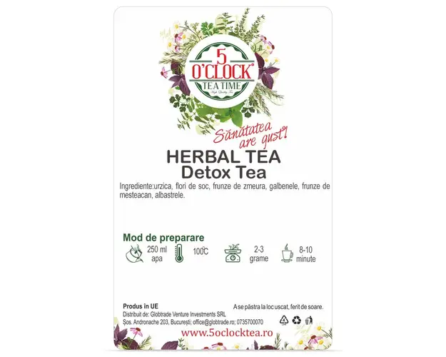Despre ceaiul Detox Tea Pentru ca nu putem consuma numai alimente perfect sanatoase, acumularile de toxicitate din organism trebuie eliminate folosind adjuvante naturale. De aceea un ceai ca Detox Tea ar trebui sa fie nelipsit din curele de detoxifiere, datorita ingredientelor sale. Frunzele de mesteacan argintiu sunt recunoscute pentru sustinerea bunei functionari a sistemului digestiv si a procesului natural de detoxifiere a organismului. Papadia si planta de unguras pot avea o influenta pozitiva asupra micro-circulatiei sanguine. Ingrediente: urzica, flori de soc, frunze de zmeura, galbenele, frunze de mesteacan, albastrele. Produs in UE. Merge cu: se consuma fara a fi acompaniat de alimente. Recomandari de servire: Pentru a imbogati si mai mult gustul adauga o felie de lamaie sau de portocala. Mod de Preparare: Pentru a prepara o ceasca de ceai, adaugati apa fierbinte ( 100?C) peste o lingurita cu ceai (aproximativ 2-2.5 gr) si lasati la infuzat timp de 8-10 minute. Dozaj portie 2-2.5 grame Temperatura apa 100C Timp de preparare 8-10 minute Valori nutritionale Per 100g Nivel teina Energie (kj/kcal) 18/4 Grasimi 0g din care acizi grasi saturati 0g Carbohidrati 0g din care zaharuri 0g Proteine 0g Sare 0.03g Produsul cu denumirea Detox Tea (Gramaj: 100g) face parte din brandul , se afla in categoria Specialitati si subcategoria