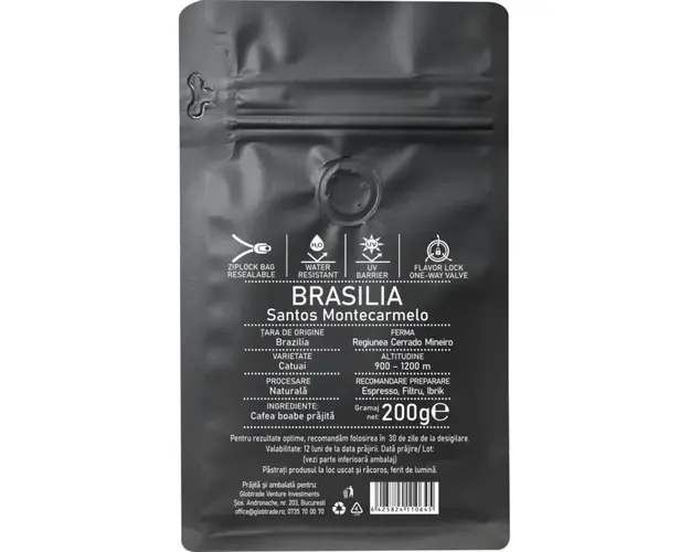Sortimentul de cafea artizanala de origine Brazilia te va surprinde prin notele dulci de caramel, prin corpolenta ridicata, aroma bogata de migdale, note condimentate si citrice. Prezinta o aciditate redusa, fiind ideal de savurat atat dimineata devreme, cat si dupa masa de pranz, in timpul desertului. Cafeaua artizanala reprezinta grija pentru detalii: este produsa de regula in ferme individuale, este prelucrata in loturi mici si mai usor prajita, la un grad mediu, oferindu-ne ocazia de a tine sub control aciditatea specifica fiecarei regiuni, implicit calitatea pana sa ajunga in cana dumneavoastra. Este ambalata imediat dupa procesul de prajire si odata cu eliminarea gazelor specifice, doar aerul din interiorul ambalajului va fi expulzat prin valva unidirectionala cu care acesta este prevazut, astfel obtinand o cafea cu un gust intens si o prospetime ce dureaza pana la 12 luni. Ambalajul este prevazut cu un sistem de deschidere-resigilare, astfel: daca se doreste pastrarea cafelei in ambalajul original si resigilarea acestuia, se va deschide cu ajutorul cheitei de pe verso, deasupra valvei unidirectionale. Proaspat prajita in Romania. Tara de origine: Brazilia, Regiunea fermei: Cerrado Mineiro; Varietate: Catuai, altitudine: 900-1200m. Produsul cu denumirea Dolce Bacio Artisan Brasilia Santos Montecarmelo 200g boabe face parte din brandul , se afla in categoria Capsule cafea si subcategoria