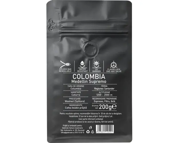 Sortimentul de cafea artizanala Colombia Medellin Supremo te va surprinde prin notele de vanilie si caramel, conceput cu grija pentru iubitorii cafelei de calitate. Se remarca prin gustul bogat, usor dulceag. Predomina notele de fructe si ciocolata, insa vei remarca si note secundare de caramel. Cu toate ca are o aroma naturala dulceaga, aciditatea este destul de ridicata. Cafeaua artizanala reprezinta grija pentru detalii: este produsa de regula in ferme individuale, este prelucrata in loturi mici si mai usor prajita, la un grad mediu, oferindu-ne ocazia de a tine sub control aciditatea specifica fiecarei regiuni, implicit calitatea pana sa ajunga in cana dumneavoastra. Este ambalata imediat dupa procesul de prajire si odata cu eliminarea gazelor specifice, doar aerul din interiorul ambalajului va fi expulzat prin valva unidirectionala cu care acesta este prevazut, astfel obtinand o cafea cu un gust intens si o prospetime ce dureaza pana la 12 luni. Ambalajul este prevazut cu un sistem de deschidere-resigilare, astfel: daca se doreste pastrarea cafelei in ambalajul original si resigilarea acestuia, se va deschide cu ajutorul cheitei de pe verso, deasupra valvei unidirectionale. Proaspat prajita in Romania. Tara de origine: Colombia, Regiunea fermei: Santander; Varietate: Caturra; altitudine: 1200-2000m. Produsul cu denumirea Dolce Bacio Artisan Columbia Supremo 200g boabe face parte din brandul , se afla in categoria Capsule cafea si subcategoria