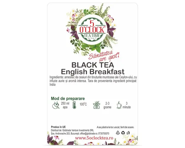 English Breakfast este cu siguranta cel mai consumat ceai din tarile europene. Denumirea de "English Breakfast" provine de la comerciantii care l-au introdus pe piata britanica si i-a fost conferita datorita faptului ca era foarte bine asortat cu micul dejun englezesc. Ceaiul English Breakfast a fost facut cunoscut de catre regina Victoria, o mare iubitoare de ceai negru. Gustul puternic si aromat ii confera ceaiului English Breakfast, pe langa complexitate si gust placut, o nota speciala de asprime. Ceaiul negru isi pastreaza aroma un timp mai indelungat decat ceaiul verde. English Breakfast este o adevarata bijuterie intre ceaiurile negre, fiecare strop dezvaluind gustul clasic si elegant. Ingrediente: amestec de ceaiuri din tinuturile muntoase ale Ceylon-ului, cu infuzie aurie si aroma intensa. Tara de provenienta ingredient principal: India. Produs in UE. Merge cu: lapte, sandwichuri. Recomandari de servire: Intrucat ceaiul negru are un gust mai puternic, poti adauga in ceai o cantitate foarte mica de lapte. Mod de Preparare: Pentru prepararea unei cesti de ceai, adaugati apa fierbinte ( 100C) peste o lingurita cu ceai (aproximativ 2 gr) si lasati la infuzat timp de 3 minute. Dozaj portie 2 grame Temperatura apa 100C Timp de preparare 3 minute Valori nutritionale Per 100g Nivel teina Energie (kj/kcal) 0/0 Grasimi 0g din care acizi grasi saturati 0g Carbohidrati 0g din care zaharuri 0g Proteine 0g Sare 0g Produsul cu denumirea English Breakfast (Gramaj: 100g) face parte din brandul , se afla in categoria Tip cafea si subcategoria