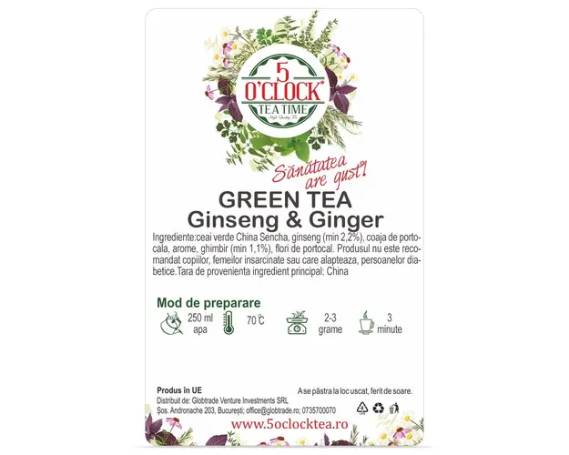 Un ceai deosebit, ce imbina beneficiile ceaiului verde cu proprietatile miraculoase ale Ginsengului si Ghimbirului . Sortimentul de ceai de ghimbir se numara printre cele mai apreciate ceaiuri, iar cand acesta contine si ceai verde, beneficiile sale se dubleaza. Ceaiul de ghimbir este bogat in substante antioxidante, care te ajuta sa iti pastrezi frumusetea pielii. De asemenea, ceaiului de ghimbir i se atribuie proprietati de accelerare a metabolismului, actionand asupra depozitelor de grasime. Alte beneficii ale sortimentului de ceai de ghimbir : scade nivelul colesterolului rau din sange si previne aparitia bolilor cardiace. In plus, ghimbirul e deosebit de util in sezonul rece, ajutand la refacerea organismului in timpul episoadelor de gripa. Ginsengul are numeroase beneficii pentru sanatate: reduce efectele imbatranirii organismului si ajuta la imbunatatirea imunitatii. In plus, ginsengul este un bun afrodisiac, creste puterea de concentrare si are efect de calmare, diminuand stresul. Combinatia de ceai verde, ghimbir si ginseng este una pe cat de sanatoasa, pe atat de gustoasa, acest ceai fiind folosite de sute de ani in medicina Ayurvedica. Daca iti imaginezi ca un astfel de ceai de ghimbir cu ceai verde si ginseng are un pret colosal, ei bine, te inseli. In magazinul nostru il gasesti la un pret foarte bun si la gramaje ce pornesc de la 50 pana la 200 de grame, astfel incat sa poti cumpara exact cantitatea dorita. Incearca si tu acest sortiment revigorant de ceai verde cu ghimbir! Ingrediente: ceai verde China Sencha, ginseng (min 2,2%), coaja de portocala, arome, ghimbir (min 1,1%), flori de portocal. Produsul nu este recomandat copiilor, femeilor insarcinate sau care alapteaza, persoanelor diabetice.Tara de provenienta ingredient principal: China. Produs in UE. Merge cu: deserturi pe baza de fructe, nuci. Recomandari de servire: In cazul suprainfuzarii, ceaiurile verzi si albe pot capata un gust usor amarui. Pentru o aroma mai puternica, poti folosi o cantitate mai mare de ceai in locul cresterii duratei de infuzare. Mod de Preparare: Pentru a prepara o ceasca de ceai, adaugati apa fierbinte ( 70C) peste o lingurita cu ceai (aproximativ 2 gr) si lasati la infuzat timp de 2-3 minute. Pentru Ice Tea folositi o cantitate dubla de ceai (4 grame) si adaugati cuburi de gheata dupa infuzare. Dozaj portie 2 grame Temperatura apa 70C Timp de preparare 2-3 minute Valori nutritionale Per 100g Nivel teina Energie (kj/kcal) 0/0 Grasimi 0g din care acizi grasi saturati 0g Carbohidrati 0g din care zaharuri 0g Proteine 0g Sare 0g Produsul cu denumirea Ginseng & Ginger (Gramaj: 100g) face parte din brandul , se afla in categoria Tip cafea si subcategoria
