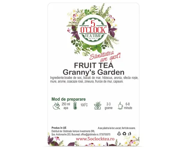Iata un ceai natural de fructe care ne aduce aminte de copilarie si de livada bunicii, care mirosea a flori mar si a fructe dulci si zemoase. Este un ceai cu gust delicios de mure, coacaze si capsuni, la care se adauga aroma delicata a socului. Ideal de preparat si in varianta Ice Tea, pentru o pauza racoroasa in zilele fierbinti. Ingrediente: boabe de soc, bucati de mar, hibiscus, aronia, sfecla rosie, mure, arome, coacaze rosii, zmeura, frunze de mur, capsuni. Produs in UE. Merge cu: tarte cu fructe de padure, cheesecake. Recomandari de servire: Pentru a imbogati si mai mult gustul adauga o felie de lamaie sau de portocala, sau putina scortisoara. Mod de Preparare: Pentru a prepara o ceasca de ceai, adaugati apa fierbinte ( 100C) peste o lingurita cu ceai (aproximativ 3 gr) si lasati la infuzat timp de 6-8 minute. Pentru Ice Tea folositi o cantitate dubla de ceai (6 grame) si adaugati cuburi de gheata dupa infuzare. Dozaj portie 3 grame Temperatura apa 100C Timp de preparare 6-8 minute Valori nutritionale Per 100g Nivel teina Energie (kj/kcal) 0/0 Grasimi 0g din care acizi grasi saturati 0g Carbohidrati 0g din care zaharuri 0g Proteine 0g Sare 0g Produsul cu denumirea Granny's Garden (Gramaj: 200g) face parte din brandul , se afla in categoria Tip cafea si subcategoria