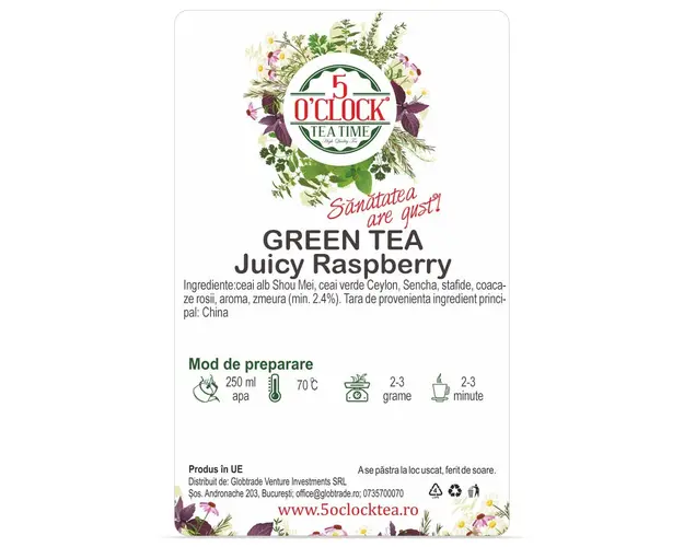 Ceaiul Juicy Raspberry imbina gustul delicios de zmeura coapta si coacaze rosii cu aroma eleganta si delicata a ceaiului alb. Printre caracteristicile acestui ceai alb se numara gustul delicat si dulceag si aroma echilibrata de zmeura. Datorita procesarii minime, ceaiul alb are un continut de nutrienti mult mai mare decat la ceaiurile negre sau verzi. In timpul procesului de productie a ceaiului alb, frunzele nu sunt lasate sa oxideze, ele ramanand practic mai aproape de starea lor naturala, evident si cu o cantitate mai mare de antioxidanti. Ingrediente: ceai alb Shou Mei, ceai verde Ceylon, Sencha, stafide, coacaze rosii, aroma, zmeura (min. 2.4%). Tara de provenienta ingredient principal: China. Produs in UE. Merge cu: orez, salate simple. Recomandari de servire: In cazul suprainfuzarii, ceaiurile verzi si albe pot capata un gust usor amarui. Pentru o aroma mai puternica, poti folosi o cantitate mai mare de ceai in locul cresterii duratei de infuzare. Mod de Preparare: Pentru a prepara o ceasca de ceai, adaugati apa fierbinte ( 70C) peste o lingurita cu ceai (aproximativ 2 gr) si lasati la infuzat timp de 2-3 minute. Pentru Ice Tea folositi o cantitate dubla de ceai (4 grame) si adaugati cuburi de gheata dupa infuzare. Dozaj portie 2 grame Temperatura apa 70C Timp de preparare 2-3 minute Valori nutritionale Per 100g Nivel teina Energie (kj/kcal) 18/4 Grasimi 0g din care acizi grasi saturati 0g Carbohidrati 0g din care zaharuri 0g Proteine 0g Sare 0.03g Produsul cu denumirea Juicy Raspberry (Gramaj: 100g) face parte din brandul , se afla in categoria Tip cafea si subcategoria