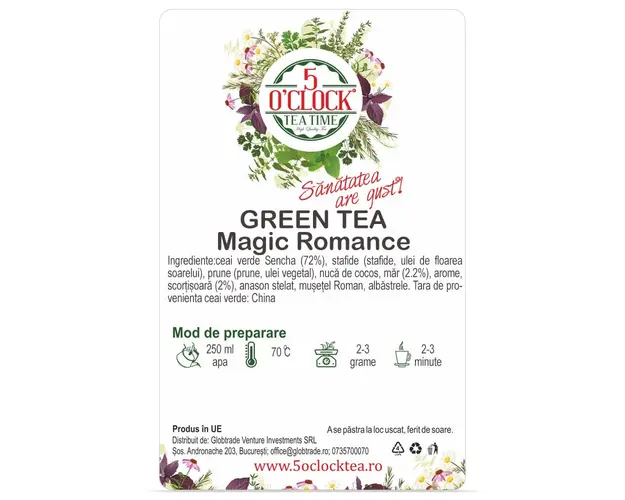 Iata un sortiment de ceai verde cu miros proaspat si revigorant si cu gust usor dulceag, dat de bucatile de fructe pe care le contine. Pe baza de frunze de ceai verde Sencha, acest sortiment are un nivel moderat de teina si un efect relaxant, astfel ca este ideal de savurat in pauzele de peste zi. Nivelul ridicat de antioxidanti pe care il contine ceaiul verde il transforma in bautura care nu trebuie sa lipseasca din meniul nostru zilnic. Amestecul de frunze de ceai verde cu fructe si scortisoara va fi pe placul persoanelor care vor sa inlocuiasca deserturile pline de zahar si calorii cu un desert de baut, prietenos cu silueta, ce nu necesita indulcire. Ceaiul verde Magic Romance se ppate prepara si in varianta Ice Tea natural cu care putem inlocui sucurile gata preparate din comert. Ingrediente: ceai verde Sencha (72%), stafide (stafide, ulei de floarea soarelui), prune (prune, ulei vegetal), nuca de cocos, mar (2.2%), arome, scortisoara (2%), anason stelat, musetel Roman, albastrele. Tara de provenienta ceai verde: China. Produs in UE. Merge cu: deserturi, foietaje, salate de fructe. Recomandari de servire: In cazul suprainfuzarii, ceaiurile verzi si albe pot capata un gust usor amarui. Pentru o aroma mai puternica, poti folosi o cantitate mai mare de ceai in locul cresterii duratei de infuzare. Mod de Preparare: Pentru a prepara o ceasca de ceai, adaugati apa fierbinte ( 70C) peste o lingurita cu ceai (aproximativ 2 gr) si lasati la infuzat timp de 2-3 minute. Pentru Ice Tea folositi o cantitate dubla de ceai (4 grame) si adaugati cuburi de gheata dupa infuzare. Dozaj portie 2 grame Temperatura apa 70C Timp de preparare 2-3 minute Valori nutritionale Per 100g Nivel teina Energie (kj/kcal) 18/4 Grasimi 0g din care acizi grasi saturati 0g Carbohidrati 0g din care zaharuri 0g Proteine 0g Sare 0.03g Produsul cu denumirea Magic Romance (Gramaj: 200g) face parte din brandul , se afla in categoria Tip cafea si subcategoria