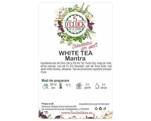 Daca va plac ceaiurile albe si verzi, ceaiul Mantra are toate sansele sa intre pe lista dumneavoastra de ceaiuri preferate. Ceaiul Mantra imbina gustul delicat al ceaiurilor albe si verzi atent selectionate, cu beneficiile fructelor Goji. Numit si fructul longevitatii, Goji a fost incadrat in categoria super-alimentelor cu multiple beneficii pentru sanatate: sursa de antioxidanti ce incetinesc imbatranirea pielii, cresc imunitatea, ajuta la protejarea oaselor si a ligamentelor, datorita continutului ridicat in minerale si nutrienti. Ingrediente: Cceai alb Shou Mei si Pai Mu Tan, fructe Goji, coaja de rodie, arome naturale, ceai alb Pu Erh Moonlight, ceai alb Snow Buds, ceai verde White Monkey, albastrele. Tara de provenienta ingredient principal: China. Produs in UE. Merge cu: orez, salate simple. Recomandari de servire: In cazul suprainfuzarii, ceaiurile verzi si albe pot capata un gust usor amarui. Pentru o aroma mai puternica, poti folosi o cantitate mai mare de ceai in locul cresterii duratei de infuzare. Mod de Preparare: Pentru a prepara o ceasca de ceai, adaugati apa fierbinte ( 70C) peste o lingurita cu ceai (aproximativ 2 gr) si lasati la infuzat timp de 2-3 minute. Pentru Ice Tea folositi o cantitate dubla de ceai (4 grame) si adaugati cuburi de gheata dupa infuzare. Dozaj portie 2 grame Temperatura apa 70C Timp de preparare 2-3 minute Valori nutritionale Per 100g Nivel teina Energie (kj/kcal) 18/4 Grasimi 0g din care acizi grasi saturati 0g Carbohidrati 0g din care zaharuri 0g Proteine 0g Sare 0.03g Produsul cu denumirea Mantra (Gramaj: 50g) face parte din brandul , se afla in categoria Tip cafea si subcategoria
