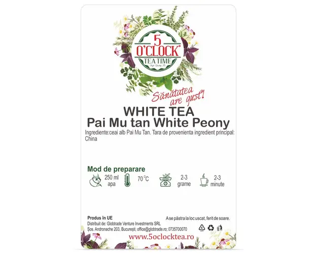 Ceaiul Pai Mu tan White Peony are o infuzie de un galben pal, un gust dulce si catifelat cu usoare note dulci de muscat. Este un ceai bland cu un gust foarte placut. Ceaiul alb este cel mai apreciat ceai datorita procesarii sale minime, ce are ca rezultat un continut de nutrienti mult mai mare decat la ceaiurile negre sau verzi. In timpul procesului de productie a ceaiului alb, frunzele nu sunt lasate sa oxideze, ele ramanand practic mai aproape de starea lor naturala, evident si cu o cantitate mai mare de antioxidanti. Ingrediente: ceai alb Pai Mu Tan. Tara de provenienta a ingredientului principal: China. Produs in UE. Merge cu: orez, salate simple Recomandari de servire: In cazul suprainfuzarii, ceaiurile verzi si albe pot capata un gust usor amarui. Pentru o aroma mai puternica, poti folosi o cantitate mai mare de ceai in locul cresterii duratei de infuzare. Mod de Preparare: Pentru a prepara o ceasca de ceai, adaugati apa fierbinte ( 70C) peste o lingurita cu ceai (aproximativ 2 gr) si lasati la infuzat timp de 2-3 minute. Pentru Ice Tea folositi o cantitate dubla de ceai (4 grame) si adaugati cuburi de gheata dupa infuzare. Dozaj portie 2 grame Temperatura apa 70C Timp de preparare 2-3 minute Valori nutritionale Per 100g Nivel teina Energie (kj/kcal) 0/0 Grasimi 0g din care acizi grasi saturati 0g Carbohidrati 0g din care zaharuri 0g Proteine 0g Sare 0g Produsul cu denumirea Pai Mu tan White Peony (Gramaj: 200g) face parte din brandul , se afla in categoria Tip cafea si subcategoria